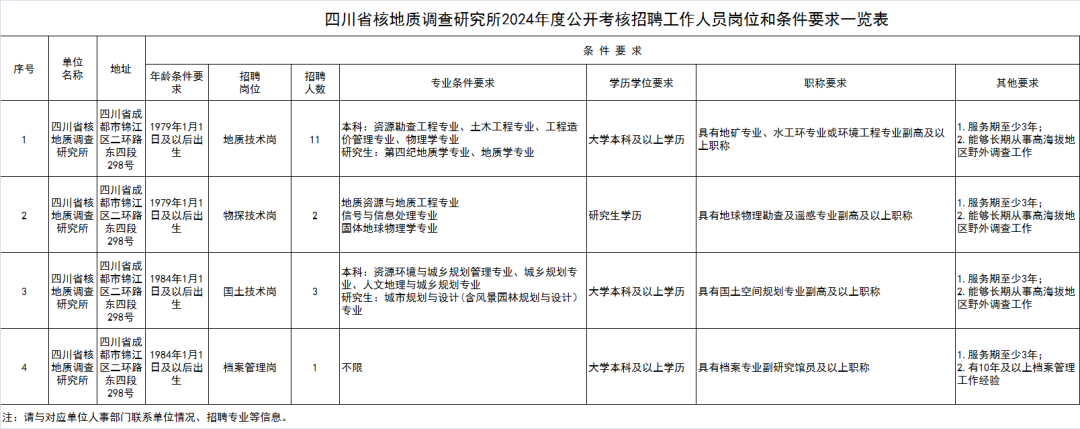 四川省核地质调查研究所2024年公开考核招聘工作人员的公告 根据《四川省省属事业单位公开招聘工作人员实施细则(试行)》(川人发〔2006〕34号)、《四川省人力资源和社会保障厅关于考核招聘地勘水文急需短缺专业技术岗位工作人员的通知》(川人社函〔2022〕528号)有关规定,四川省核地质调查研究所拟面向全国公开考核招聘17名工作人员。现将有关事项公告如下。 一、单位基本情况