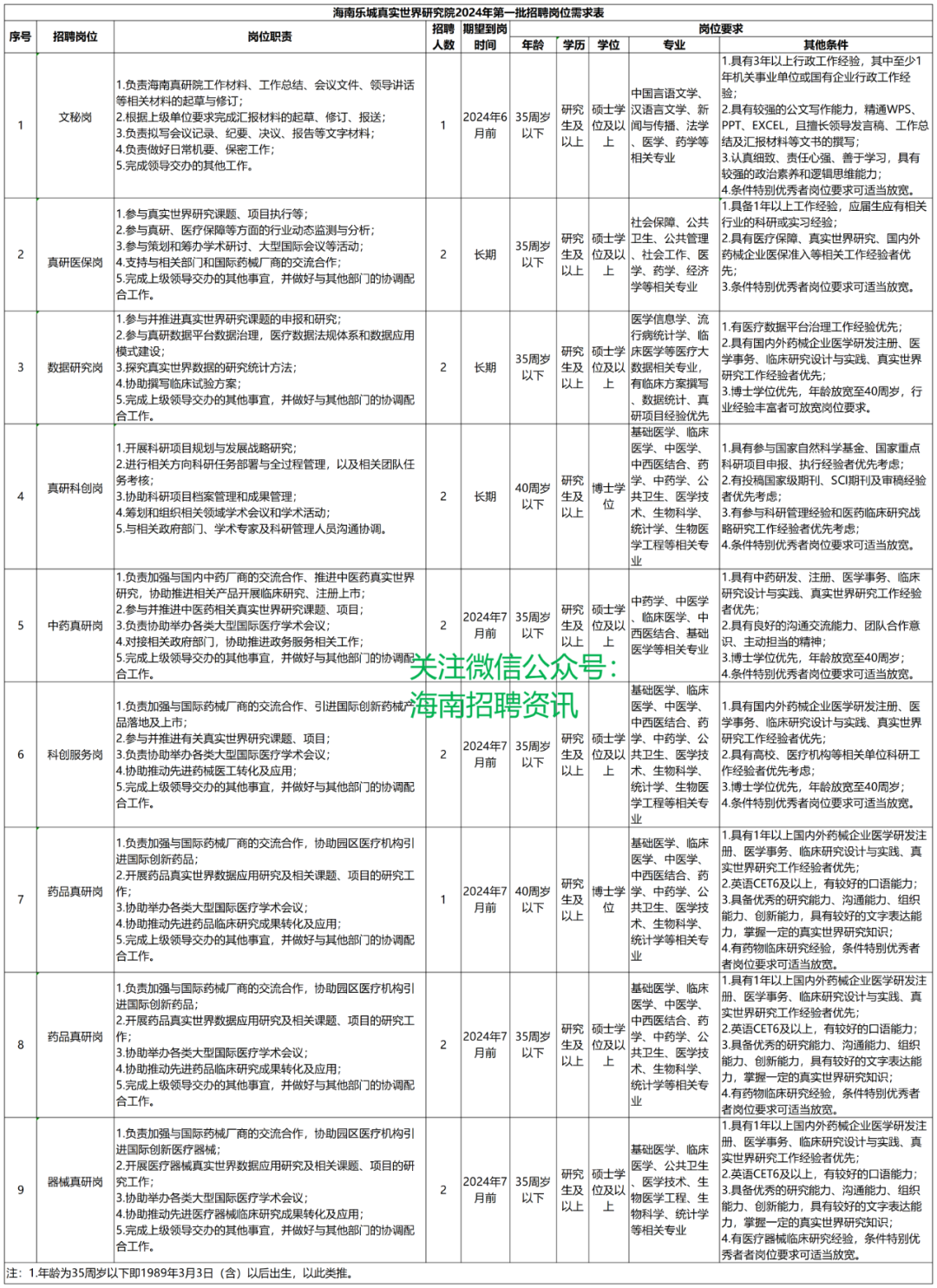 海南乐城真实世界研究院2024年第一批公开招聘公告 一、机构简介 海南自由贸易港博鳌乐城国际医疗旅游先行区(以下称乐城先行区)是海南自由贸易港13个重点园区之一,2013年2月28日经国务院批准成立,试点发展特许医疗、肿瘤防治、健康管理、照护康复、医美抗衰等国际医疗旅游相关产业,旨在实现医疗技术、装备、药品与国际水平“三同步”。 海南乐城真实世界研究院(以下称海南真研院)为国家药监局在乐城先行区设立的药品医疗器械监管科学研究基地,海南博鳌乐城国际医疗旅游先行区管理局是海南真研院的业务主管单位。依托乐城先行区的先行先试的政策优势,海南真研院旨在通过打造成一个开放式的科研共享平台,推进中国真实世界数据研究事业发展,助力国家药监局审评审批改革创新,加快推进药品、医疗器械真实世界数据标准以及采集、分析、运用等研究,探索审评及监管新工具、新标准和新方法,助力药品医疗器械监管体系和监管能力现代化。 二、招聘原则 坚持公开、公平、公正原则;坚持竞争上岗、择优聘用原则。 三、招聘条件及岗位 (一)应聘人员应具备以下基本条件 1.拥护中华人民共和国宪法,遵守国家法律、法规,无违法犯罪行为; 2.具有良好的素质、品行、职业道德; 3.具备与招聘职位相匹配的知识储备、任职经历和专业素养(详见岗位职责及任职要求)。