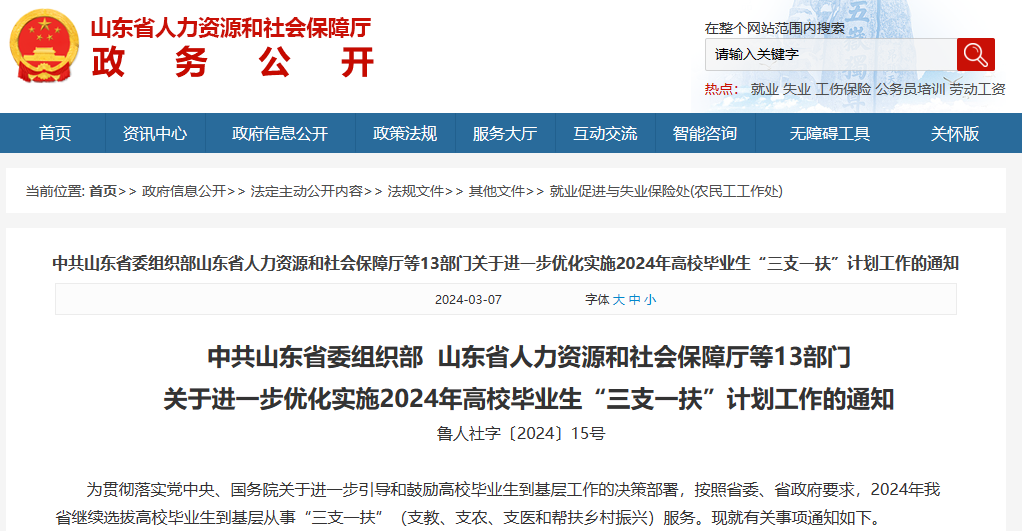 ![]() 3月7日 山东省人力资源和社会保障厅网站发布 中共山东省委组织部 山东省人力资源和社会保障厅等13部门 关于进一步优化实施 2024年高校毕业生“三支一扶”计划工作的通知 ![]() 鲁人社字〔2024〕15号 为贯彻落实党中央、国务院关于进一步引导和鼓励高校毕业生到基层工作的决策部署,按照省委、省政府要求,2024年我省继续选拔高校毕业生到基层从事“三支一扶”(支教、支农、支医和帮扶乡村振兴)服务。现就有关事项通知如下。 一、贴近需求设置岗位。2024年全省“三支一扶”计划要紧紧贴近全面推进乡村振兴、绿色低碳高质量发展、黄河流域生态保护和高质量发展等重大战略需求,开发基层事业发展急需紧缺岗位,拓展乡村建设助理、农技推广、水利基础设施建设与运行管理、林草生态保护修复、医疗卫生、基层思想宣传和乡村文化振兴等服务岗位。岗位设置一律安排在乡镇及以下单位或实际工作地在乡镇的岗位,继续向乡村振兴重点帮扶地区、沿黄地区、革命老区等倾斜,继续允许各地设有村委会的街道办事处参照乡镇在编制和岗位空缺数额内招募“三支一扶”人员,继续允许省委组织部等11部门《关于鼓励引导人才向基层流动的若干意见》(鲁组字〔2019〕32号)明确的重点扶持区域、乡村振兴重点帮扶县和菏泽、枣庄、德州、聊城、滨州5市按不低于50%比例设置面向本地户籍或本地生源高校毕业生的岗位。 二、合理确定招募规模。2024年全省计划招募“三支一扶”人员1300名左右。各地要以县为单位,在乡镇事业编制总体空编的前提下,结合岗位空缺情况开展岗位需求征集。各市人力资源社会保障部门会同机构编制部门(加盖两部门公章)审核汇总年度招募计划招募岗位需求表(见附件1),报省人力资源社会保障厅,由省人力资源社会保障厅商省委机构编制部门同意后,统筹安排招募计划。各市要在3月7日前将《2024年高校毕业生“三支一扶”计划招募岗位需求表》报送至省人力资源社会保障厅。 三、统一组织选拔招募。省人力资源社会保障厅会同各相关部门,统一组织招募选拔工作,及早安排招募时间,原则上6月底前完成人员招募工作。2024年“三支一扶”计划岗位招募人员对象为山东省内普通高校毕业生(含非山东户籍毕业生)以及省外普通高校和国家承认学历的海外高校全日制大学的山东户籍毕业生,年龄上限统一为30周岁(含),学历下限为专科,高级技工学校、技师学院毕业生可按有关规定应聘符合条件的岗位。招募岗位不设开考比例,分类划定最低分数线,对过最低分数线考生允许进行调剂,降低招募计划流失率。上年度未招到或未招满的岗位如2024年继续招募,应放宽专业条件设置。对报名人数较少、招募相对困难地区的支医、支教等岗位,允许各地采用量化测评赋分等招募方式。各市可在全省招募公告、面试公告的基础上,就有关具体程序及事项制定补充公告,自行组织面试、体检、考察等。 四、普遍开展教育培训。建立贯穿全服务周期的教育培训制度,持续开展练兵比武活动,省级通过线上培训方式组织全员轮训,对其中30%左右的优秀学员开展不少于5天的脱产集中培训。各市、县人力资源社会保障部门应为“三支一扶”人员统一开展入职前培训、在岗和离岗培训,及时将“千万工程”经验、枫桥经验等针对性、实用性工作方法纳入培训课程,确保每人每年参加培训不少于40课时。人力资源社会保障、教育、水利、农业农村、卫生健康、林业草原等部门,要将本部门“三支一扶”人员纳入相应行业人才培训范围。 五、加强岗位培养锻炼。落实基层服务单位岗位培养锻炼的主体责任,建立导师制、传帮带等培养制度,择优推荐担任基层单位团委副书记、河(湖)长助理、农业技术服务站(所)长助理、林(场)长助理、基层供销社主任助理等,鼓励支持参与基层重大项目建设和重点任务。支持选派到对应上级单位进行不超过1个月的跟班学习、研修培训、顶岗锻炼等。鼓励“三支一扶”人员服务期间参加相关职业资格考试,服务满1年且考核合格后可按规定参加职称评定。 六、落实服务管理措施。“三支一扶”人员生活补贴标准,要按照当地乡镇机关或事业单位从高校毕业生中新聘用人员试用期满后的工资收入水平确定,并根据物价、同岗位人员待遇水平动态调整,保障与服务地乡镇(街道)事业单位人员享受同等福利待遇。各地应为在岗“三支一扶”人员按规定缴纳社会保险和住房公积金。多渠道搭建“三支一扶”人员交流平台,定期开展走访座谈、节日慰问等活动。加强“三支一扶”人员考核评鉴,省级每年按照不超过8%的比例对上岗半年以上且在岗的考核优秀人员进行通报表扬,对年度考核不合格的不予采取考核考察的方式公开招聘为乡镇事业单位工作人员。 七、全面加强组织领导。各市要切实加强组织领导,把“三支一扶”计划作为全面推进乡村振兴、吸引青年人才基层就业、促进高校毕业生就业工作的重要举措来抓。要加强“三支一扶”中央、省级补助资金的绩效管理和运行监控,继续向突破菏泽鲁西崛起三年行动计划相关市倾斜。要加强全国高校毕业生“三支一扶”工作管理信息系统应用,及时采集信息、上报数据和更新服务状态。要强化宣传引导,打造“支扶青年”品牌,做好新招募人员的赴基层服务出征仪式