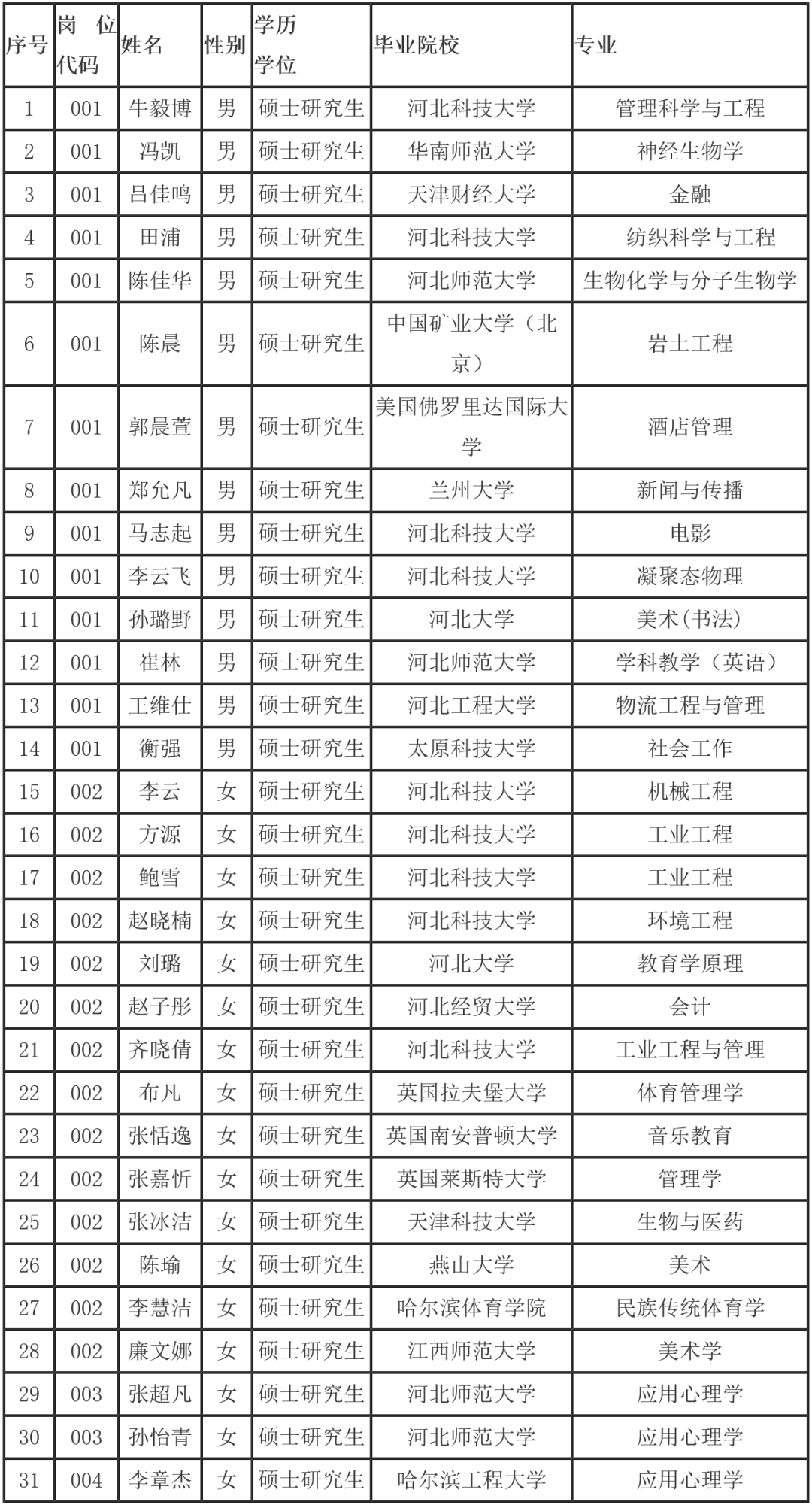 点击上方名片关注“燕赵教师招聘网”,查看河北省教师最新招聘信息。建议置顶标星~有疑问,请加微信:hbrsksw8。如需交流,请加QQ群:528479976。 河北科技大学2023年公开招聘拟聘人员名单公示根据《河北省事业单位公开招聘工作人员暂行办法》和《河北科技大学2023年公开招聘工作人员公告》,经报名、资格审查、考试、体检、心理测试、考察等程序,确定以下31人为拟聘人员,现予以公示: