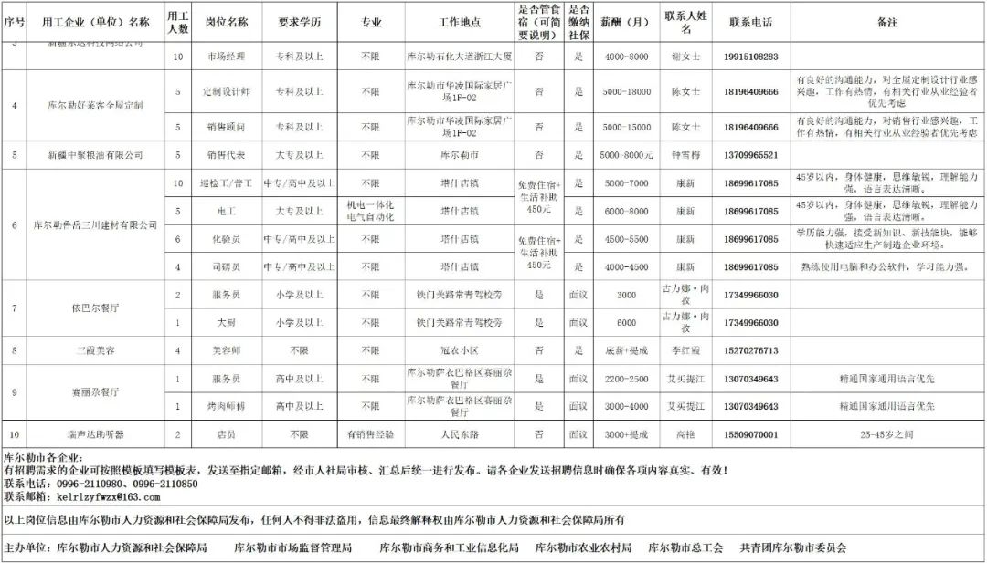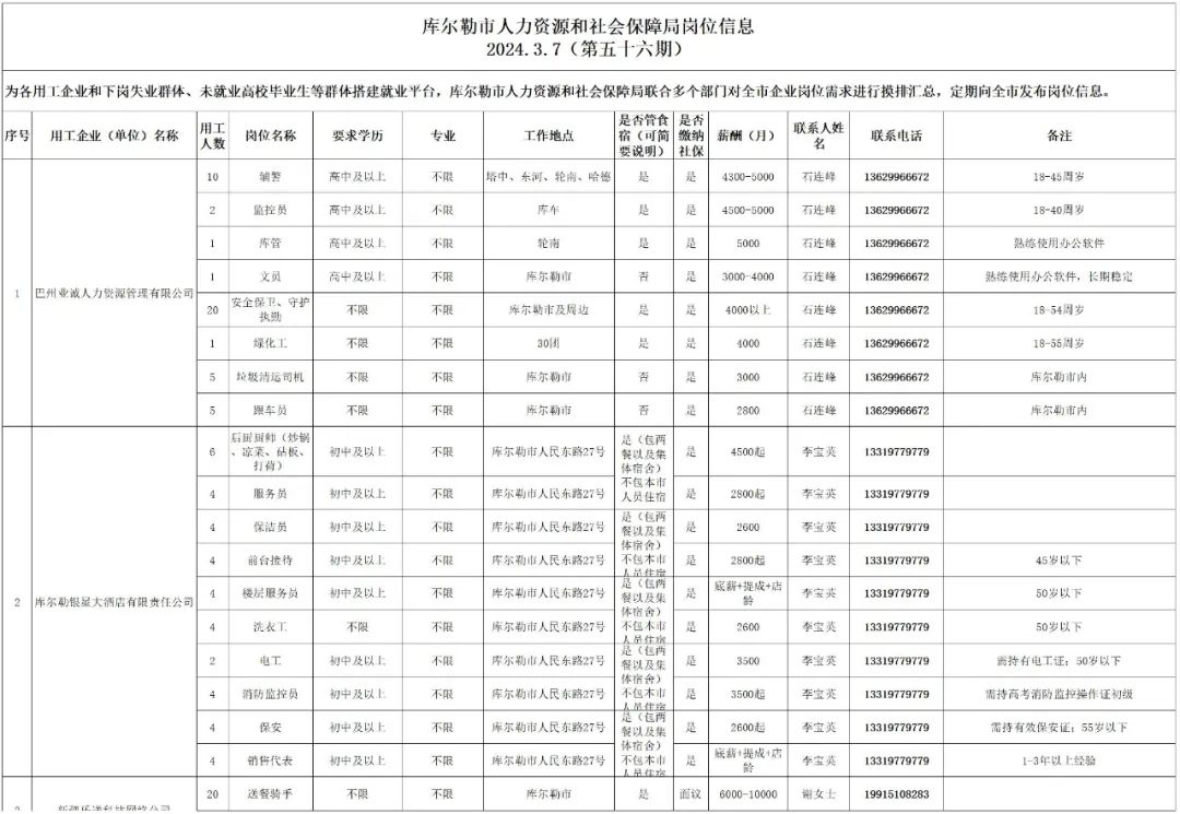 顶送外卖 5000-8000元 招聘30人 职位要求:经验不限/年龄不限/ 职位福利:[包住][节日福利][其他] 公司名称:库尔勒蓝骑外卖递送服务中心 公司地址:巴音郭楞蒙古自治州库尔勒市铁克其乡铁克其路 (长按二维码查看详情)顶油田前线保安 4000-5000元 招聘30人 职位要求:经验不限/50岁以下 职位福利:[加班补助][包吃][包住][医保][社保] 公司名称:爱克威保安有限公司 公司地址:塔里木油田 (长按二维码查看详情)顶工地消防排烟通风管道,消防弱电 面议 招聘人数:若干 职位要求:经验不限/40岁以下 公司名称:佳顺机械设备有限公司 公司地址:巴音郭楞蒙古自治州库尔勒市退水渠路 (长按二维码查看详情)顶库管 5000-8000元 招聘10人 职位要求:经验不限/50岁以下 职位福利:[餐补][包吃][医保][社保][节日福利][其他] 公司名称:康宁医药连锁有限责任公司 公司地址:巴音郭楞蒙古自治州库尔勒市上户镇光华路 (长按二维码查看详情)业务经理 4000-5000元 招聘人数:若干 职位要求:经验不限/年龄不限/ 职位福利:[年终奖][节日福利][其他] 公司名称:新疆乐送网络科技有限公司 公司地址:巴音郭楞蒙古自治州库尔勒市铁克其路 (长按二维码查看详情)渠道销售 12000-20000元 招聘20人 职位要求:3-5年/年龄不限/ 职位福利:[话补] 公司名称:和静县东归缘水业有限责任公司 公司地址:巴音郭楞蒙古自治州和静县和静镇G218(天鹅湖路) (长按二维码查看详情)工程学徒 4000-5000元 招聘2人 职位要求:经验不限/35岁以下 职位福利:[包吃][包住] 公司名称:永宏工程管理服务有限责任公司 公司地址:铁门关市博古其镇人民路9 (长按二维码查看详情)库管 5000-8000元 招聘10人 职位要求:1-3年/40岁以下 职位福利:[包吃][医保][社保][年终奖][节日福利][年假][婚假][其他] 公司名称:康宁医药有限公司 公司地址:巴音郭楞蒙古自治州库尔勒市上户镇X223 (长按二维码查看详情)业务员 面议 招聘1人 职位要求:经验不限/年龄不限/ 职位福利:[餐补][话补][社保][节日福利] 公司名称:巴州幸福聚鑫商贸有限公司 公司地址:巴音郭楞蒙古自治州库尔勒市景园路 (长按二维码查看详情)保管员,巡检工 4000-5000元 招聘5人 职位要求:经验不限/40岁以下 职位福利:[包吃][包住][医保][社保][其他] 公司名称:库车吉旭劳务派遣公司 公司地址:油田各作业区 (长按二维码查看详情)收银员 4000-5000元 招聘1人 职位要求:经验不限/30岁以下 职位福利:[其他] 公司名称:万豪名仕 公司地址:巴音郭楞蒙古自治州库尔勒市滨河路20号 (长按二维码查看详情)库房库管 5000-8000元 招聘10人 职位要求:经验不限/40岁以下 职位福利:[社保][节日福利][其他] 公司名称:康宁医药配送部 公司地址:巴音郭楞蒙古自治州库尔勒市恰尔巴格乡S323 (长按二维码查看详情)银行客服 5000-8000元 招聘人数:若干 职位要求:经验不限/年龄不限/ 职位福利:[医保][社保][年终奖][住房公积金][节日福利][年假][婚假] 公司名称:银行续收专员 公司地址:巴音郭楞蒙古自治州库尔勒市延安路 (长按二维码查看详情)配菜师傅、面点师傅、厨房学徒 面议 招聘10人 职位要求:经验不限/年龄不限/ 职位福利:[加班补助][包吃][包住][节日福利][其他] 公司名称:大河宴椒麻鱼交通路店 公司地址:巴音郭楞蒙古自治州库尔勒市萨依巴格街道交通西路6号 (长按二维码查看详情)形象管理岗 4000-5000元 招聘10人 职位要求:经验不限/40岁以下 职位福利:[餐补][社保] 公司名称:领悦物业集团有限公司巴州分公司 公司地址:巴音郭楞蒙古自治州库尔勒市石化大道 (长按二维码查看详情)工艺安全员 面议 招聘3人 职位要求:1-3年/40岁以下 职位福利:[包住][节日福利][婚假][其他] 公司名称:新疆施可丰农业科技有限公司 公司地址:铁门关市双丰镇 (长按二维码查看详情)仪表锅炉工 面议 招聘2人 职位要求:1-3年/40岁以下 职位福利:[包住][节日福利][其他] 公司名称:新疆施可丰农业科技有限公司 公司地址:铁门关经济技术开发区三十团双丰工业园区南环路1号 (长按二维码查看详情)车间操作工 4000-5000元 招聘人数:若干 职位要求:经验不限/年龄不限/ 职位福利:[包住][节日福利][其他] 公司名称:新疆施可丰农业科技有限公司 公司地址:铁门关经济技术开发区三十团双丰工业园区南环路1号 (长按二维码查看详情)机电维修工 面议 招聘4人 职位要求:1-3年/40岁以下 职位福利:[加班补助][包住][节日福利][其他] 公司名称:新疆施可丰农业科技有限公司 公司地址:铁门关经济技术开发区三十团双丰工业园区南环路1号 (长按二维码查看详情)仓储管理员 3000-4000元 招聘2人 职位要求:1年以下/35岁以下 职位福利:[加班补助][包住][医保][社保][节日福利][其他] 公司名称:新疆施可丰农业科技有限公司 公司地址:铁门关经济技术开发区三十团双丰工业园区南环路1号 (长按二维码查看详情)做饭师傅 4000-5000元 招聘2人 职位要求:经验不限/年龄不限/ 职位福利:[包吃][包住][医保][社保] 公司名称:巴州金泉商砼有限公司库尔勒分公司 公司地址:巴音郭楞蒙古自治州库尔勒市新城街道华州路 (长按二维码查看详情)化验员 面议 招聘2人 职位要求:1年以下/35岁以下 职位福利:[加班补助][包住][医保][社保][节日福利][其他] 公司名称:新疆施可丰农业科技有限公司 公司地址:铁门关市双丰镇 (长按二维码查看详情)司机 4000-5000元 招聘2人 职位要求:3-5年/40岁