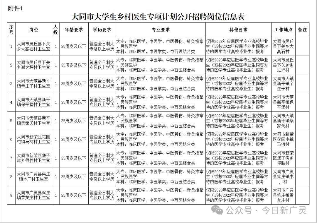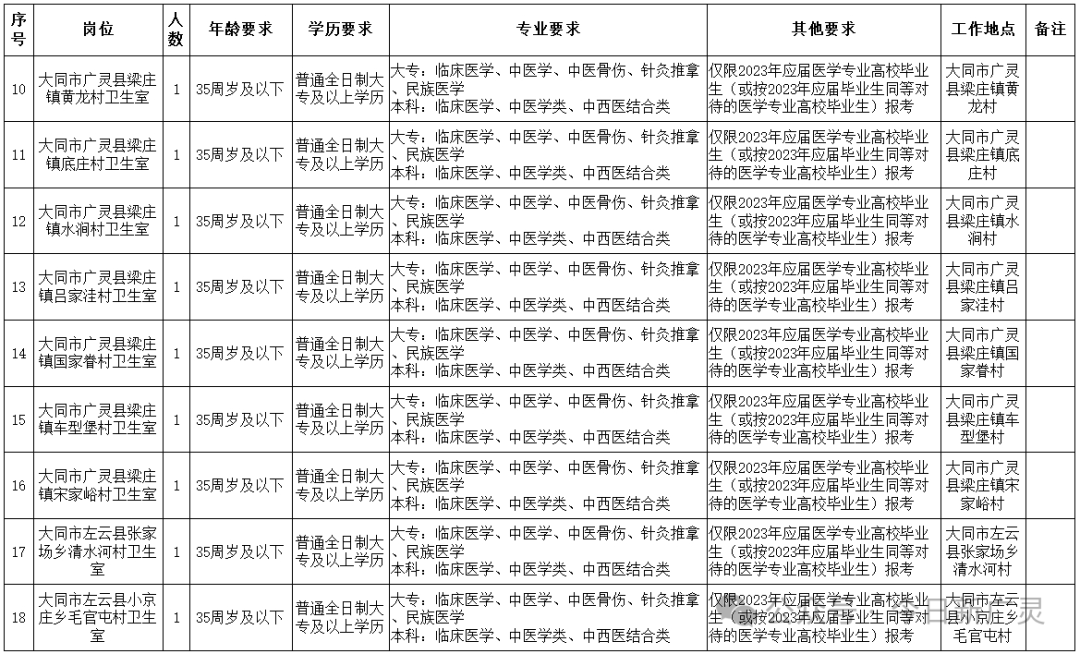 大同市2024年公开招聘大学生乡村医生18人,招聘岗位所需具体条件以《大同市大学生乡村医生专项计划公开招聘岗位信息表》(以下简称《岗位表》)的要求为准(见附件1)。