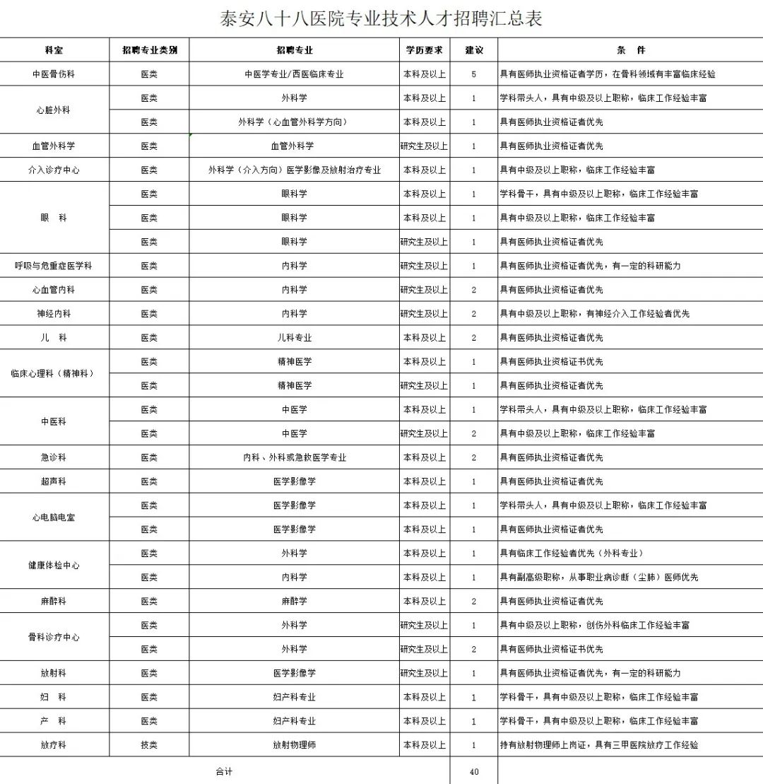 2024年泰安八十八医院专业技术人才招聘公告 为满足医院建设与发展需要,现面向社会公开引进高层次专业技术人才和初、中级岗位专业技术人员。 一、高层次专业技术人才 专业要求:心脏外科、眼科学、中医学、妇科、产科、外科学(介入方向)、放射治疗专业、心电专业、儿科、心血管内科、整形外科等专业。 任职条件: 1.身体健康,具备岗位要求的基本身体条件。 2.硕士及以上学位;副高及以上专业技术职务,有三甲综合医院工作经历者优先。 3.硕士研究生导师、博士研究生导师、担任省级专业学术团体副主任委员以上者优先考虑。 二、初、中级专业技术岗位 具体岗位及任职条件详见《泰安八十八医院招聘工作人员岗位汇总表》(附件1)。 三、招聘程序 1.报名方式 采取网上报名方式。应聘人员在规定时间内按照岗位条件要求,微信扫码下载并填写《应聘申请表》,并将所有报名材料以压缩包形式发送至报名邮箱hr88yy@126.com,每份文档均以“姓名+文档内容”命名,邮件主题栏为“应聘岗位+姓名+毕业院校”。 报名时间:长期有效,招满为止。 报名材料包括: (1)国家承认的学历和学位证书、专业技术职称证书、执业资格证书、身份证;海外留学人员应聘的必须提供经教育部留学服务中心出具的《国外学历学位认证书》。 (2)报名登记表中所填写的已发表论文、科研成果、获奖等材料。 (3)所有材料的电子版按上述顺序压缩文件包,以“应聘岗位+姓名+毕业院校”命名。 2.资格审查 对应聘人员的资格审查工作,贯穿招聘工作的全过程。应聘人员需如实填写、提交相关个人信息资料。应聘人员提供的相关材料信息如有不实,一经发现取消资格。 3.考试 考试为面试。面试采取结构化面试方式进行。主要考察应聘人员的逻辑思维能力、应变表达能力、举止仪表以及与岗位相适应的专业知识等方面的素质和能力。 四、聘用通知 对面试、考察、体检合格的拟聘用人员,发放《泰安八十八医院入职通知书》,凭《入职通知书》办理相关手续,聘用单位和受聘人员按规定签订聘用合同,确立人事关系。受聘人员按规定实行试用期制度,期满合格的正式聘用,不合格的解除聘用合同。 五、福利待遇 1.生活补贴:与医院签定3年及以上劳动合同并首次在泰安缴纳社会保险的博士研究生、硕士研究生分别按照每人每月3000元、1500元的标准发放生活补贴,保障期3年。 2.购房补助:在泰安市首次购买商品住房的40岁以下博士研究生,35岁以下的硕士研究生分别按照15万元、8万元发放一次性购房补助。 3.其他福利:参照事业单位标准发放薪酬、绩效,缴纳五险一金,享受带薪休假、定期体检、亲属就诊优惠、餐费补助、交通补助、通讯补助等福利待遇,异地人员入职,可按级别享受周转房。 六、其他事项 1.曾受过刑事处罚和曾被开除的公职人员,以及法律法规规定不得聘任的其他情形的人员不得应聘。 2.取得博士学历学位的人员,经考察合格,可直接落编属地卫生系统事业编制;其他学历人员可后续参加单位相关岗位事业编制考试。 附件1:《泰安八十八医院招聘工作人员岗位汇总表》 ![]() ![]()