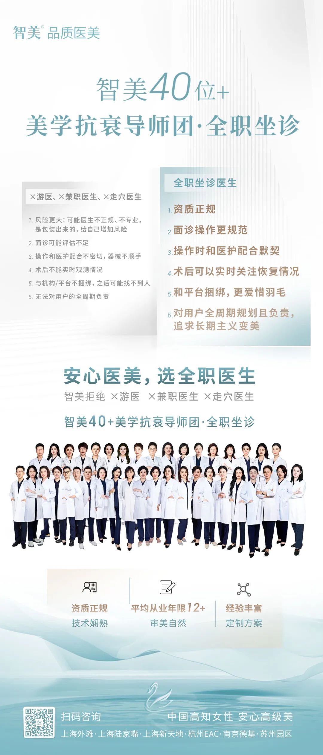 ![]() 智美40位+美学抗衰导师团始终怀抱着“以医疗为本质”的初心,爱惜自己的羽毛,对每一位求美者负责,为每一位求美者着想,让广大求美者可以拥有更美、更健康、更好的医美效果和体验~安心医美,就选智美全职医生!
