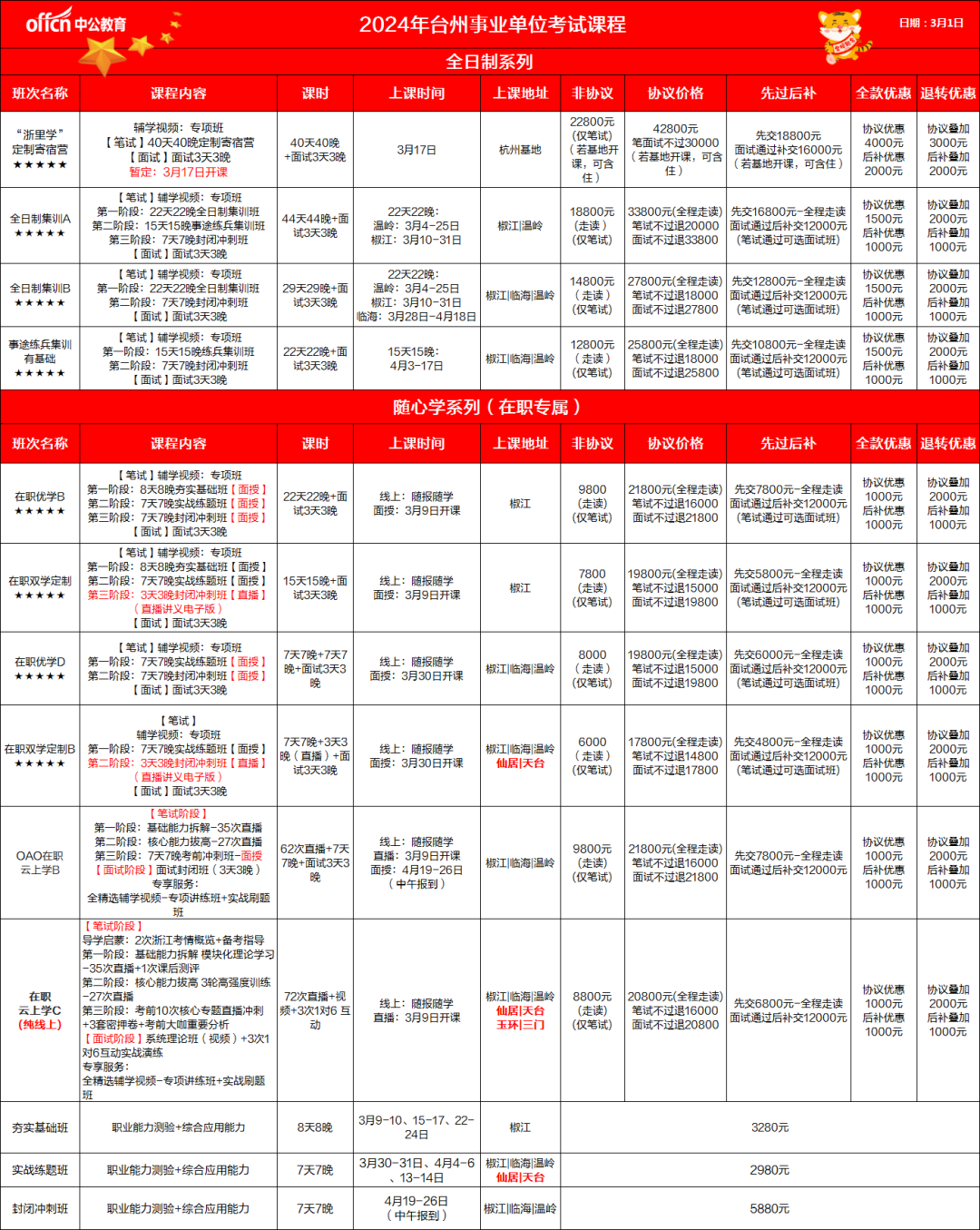 事业单位备考手册 事业单位笔试模拟卷 2024年台州事业单位考试 职测+综应,新研发模拟卷 含答案解析!电子版可下载! 事业单位笔试金题卷 浙江(台州)事业单位统考 2018-2022年考题 含答案解析!电子版可下载! 台州事业单位笔试课程 小红书搜: 台州中公教育 抖音搜:台州中公教育 ![]() 时政热点资料 ![]() 资料包包含 2024年时政热点 ![]() 资料包展示 资料领取方式 中公小曦老师 考公报考指导|课程免费咨询 |