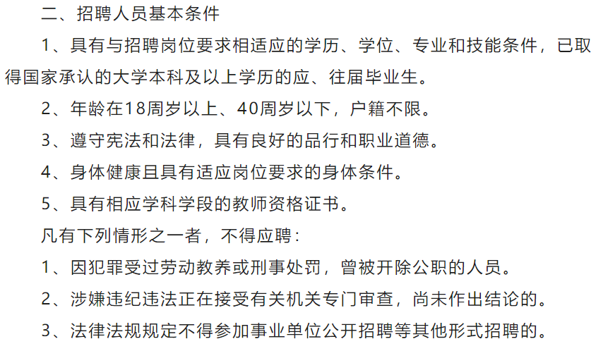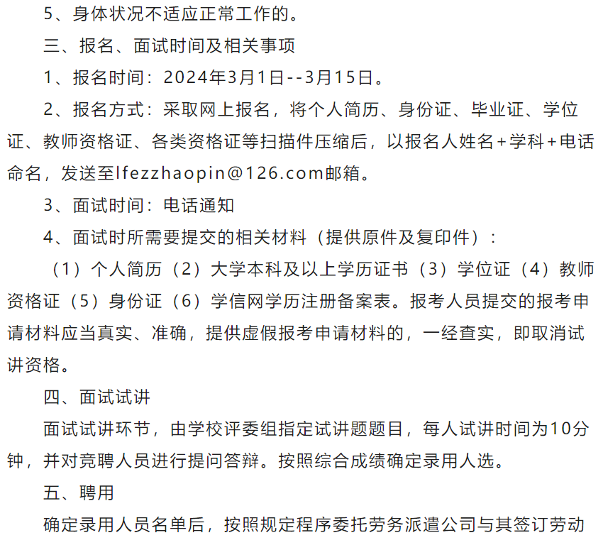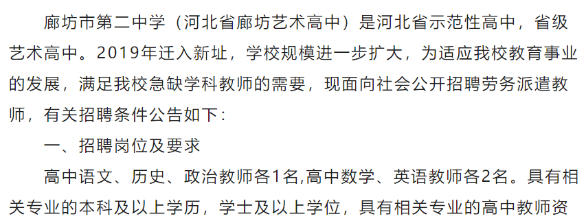 廊坊市第二中学招聘7名劳务派遣教师的公告格证。有教学经验者优先。点击查看更多招聘信息 点击上方名片关注,单独查看廊坊市招聘信息 4、按照规定需要回避的。点击查看更多招聘信息 合同,合同期限一年,试用期2个月,试用期计入劳动合同期限。点击查看更多招聘信息 六、待遇 工资待遇面议,学校为其缴纳养老保险、医疗保险、工伤保险、失业保险、生育险。为单身教师提供员工宿舍。 七、联系人及联系电话 联系人: 赵越华电话:13832606137,0316-2112618 徐静电话:17692660301,0316-2382632 廊坊市第二中学 2024年3月1日 点击关注查看廊坊市最新招聘信息 ![]() |