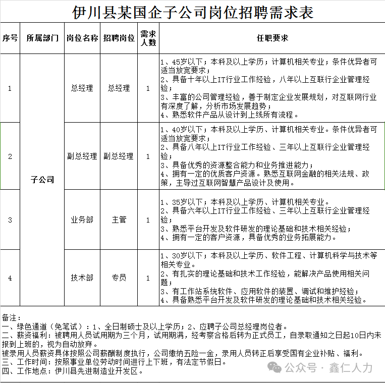 伊川县某国企公司,是贯彻落实省委、省政府机制体制改革决策部署成立的国有独资有限公司。为推动公司发展,完善企业人才队伍建设,根据公司人员需求状况,现面向社会公开招聘子公司企业管理、项目管理、业务、技术类人才,具体公告如下: 一、招聘岗位及人数 本次招聘共计 4 人,具体如下: 子公司:总经理1人、副总经理1人、业务主管1人、技术专员1人。 二、招聘原则 本次招聘工作坚持“公开招聘、公平竞争、公开选拔、流程控制、择优聘用”的原则,接受上级单位的指导和监督。 三、招聘方式 本次招聘工作委托洛阳鑫仁人力资源服务有限公司面向社会进行公开招聘。 四、招聘条件 (一)基本条件 1、政治立场坚定,拥护中国共产党的领导,遵纪守法,遵守职业道德,品行端正,有责任心,善于表达和沟通,具有良好的团队合作精神及较强的组织协调能力; 2、具有相关专业实际工作经验和履行岗位职责所必备的专业知识、良好的职业素养及身体素质; 3、国家承认的本科及以上学历; 4、无违法、违纪、违规及其他不良记录; 5、条件特别优秀或特殊人才年龄、学历可适当放宽; 6、招聘类型为企业合同工。 凡有下列情形者,不得报名: 1、剥夺政治权利尚未恢复者; 2、被判有期徒刑或被通缉,尚未结案者; 3、吸食毒品或有其它严重不良嗜好者; 4、贪污、拖欠公款,有记录在案者; 5、患有精神病或传染病者; 6、因品行恶劣,曾被政府行政机关惩罚者; 7、其他经公司认定不适合者。 (二)岗位要求及任职条件