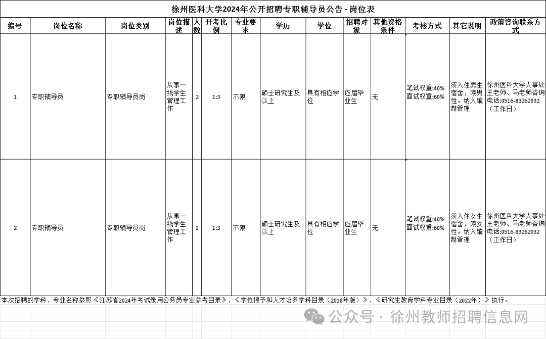 徐州医科大学是省教育厅主管的全额拨款事业单位,位于江苏省徐州市云龙区铜山路209号。为更好地选拔优秀适岗人才,充实人才队伍,优化师资结构,徐州医科大学现面向社会公开招聘优秀人才。根据《江苏省事业单位公开招聘人员办法》等规定,现将有关事项公告如下: 一、报考条件 (一)具有中华人民共和国国籍,遵守中华人民共和国宪法和法律。 (二)遵纪守法,品行端正,团结协作,敬业乐群、廉洁奉公。 (三)适应岗位要求的身体条件。 (四)中共党员(含中共预备党员)。 (五)硕士研究生及以上学历,并具有相应学位。 (六)年龄要求为:硕士研究生年龄不超过30周岁,即1994年1月1日之后出生,具有博士研究生学历学位的,不超过35周岁,即1989年1月1日之后出生。 (七)具备报考岗位要求的专业、技能等资格条件(详见岗位表),且具备下列条件之一: 1.在高校就读期间担任主要学生干部1年以上,主要学生干部指校团委、学生会、研究生会、社联、科协、艺术团副部长及以上干部,学院分团委书记和副书记、学生会、研究生会部长及以上干部,班长、团支书、党支部书记; 2.有1年高校辅导员工作经历; 3.有1年企事业单位专职从事思想政治工作经历,专职从事思想政治工作是指在党的基层委员会、总支部委员会、支部委员会担任专职书记、副书记,或在纪检和党办、组织(人事)、宣传、统战等党的工作部门中专职从事思想政治工作,或在工会、共青团、妇联专职从事思想政治工作,以及专职从事思想教育或职业道德建设工作。 计算学生干部任职经历、工作经历的截止日期为公告发布之日。 (八)本次招聘的应届毕业生须于2024年8月31日前毕业并取得学历学位证书,且仍无工作单位。2022年和2023年普通高校毕业生,若仍未落实工作单位,其档案关系仍保留在原毕业学校,或保留在各级毕业生就业主管部门(毕业生就业指导服务中心)、人才交流服务机构和公共就业服务机构的,以及国(境)外同期毕业且已完成学历认证但仍未落实工作单位的人员,可应聘应届毕业生岗位。 国(境)外教学科研机构学习同期毕业人员,指在国(境)外教学科研机构学习,与国内应届毕业生同期毕业的留学人员,同期毕业的时间要求与国内应届毕业生一致。 (九)取得祖国大陆普通高校学历的台湾学生和取得祖国大陆承认学历的其他台湾居民应聘时按国家和我省有关规定执行。 二、报名 (一)报名时间、地点、方式 应聘人员通过“江苏省属事业单位公开招聘平台”报名,照片上传、资格初审和缴费确认,均通过网络同步进行。报名网址:https://rs.jshrss.jiangsu.gov.cn/index/f/RCRS_0056(江苏省人力资源和社会保障厅网上办事服务大厅) 1.报名、照片上传:3月12日9∶00-3月22日16∶00; 2.资格初审:3月12日9∶00-3月25日16∶00; 3.陈述申辩:3月12日-3月26日期间9∶00-16∶00; 4.对初审异议的处理:3月12日9∶00-3月26日18∶00; 5.缴费确认:3月12日9∶00-3月27日12∶00。 (二)网上确认 1.应聘人员网上提交报名信息24小时后(节假日顺延)可到报名网站查询是否通过招聘部门(单位)资格初审。 2.本次公开招聘收取报名费100元,通过初审后的应聘人员进行网上支付,在网上缴纳报名费100元。通过初审并且完成缴费确认的人员,即报名成功。报名成功后,因个人原因不能参加考试考核,报名费用一律不退。 3.未按时在网上确认报名资格、上传照片、要求缴纳报名费而未缴的视为报名无效。 (三)网上打印准考证 通过资格初审和缴费确认的应聘人员,请到江苏省人力资源和社会保障厅网上办事服务大厅下载、打印准考证。打印准考证开始时间将在徐州医科大学人事处网站(https://rsc.xzhmu.edu.cn/)公布,结束时间为考试当天开考前。打印中如有问题,请拨打电话:025-52616712。 (四)报名注意事项 1.应聘人员按岗位要求和网上提示,如实填写有关信息,并在“考生简历”栏中补充填写主要学生干部任职经历或工作经历(须注明所在单位、任职职务以及任职起止年月),未填写的视作无相关经历,并上传本人近期免冠正面二寸(35X45毫米)证件照,jpg格式,大小为20Kb以下。 学校根据应聘人员提供的信息进行审核。应聘人员弄虚作假的,一经查实,即取消应聘资格。 2.本次招聘为短期招聘岗位,开考比例考核为1︰3,如未达到开考比例,将核减或取消该招聘岗位,并在省人力资源社会保障网上公告。 3.应聘人员只能从岗位表选择一个岗位报名。资格初审通过后,不可更改报名信息。未通过资格初审的应聘人员,在报名期内,可以改报符合资格条件的其他岗位。应聘人员要使用在有效期内的第二代居民身份证进行报名,报名与考场使用的身份证必须一致。 4.有下列情形之一的,请勿报名应聘: ①现役军人、普通高校在读非应届毕业生; ②与事业单位负责人员有夫妻关系、直系血亲关系、三代以内旁系血亲关系或者近姻亲关系等亲属关系的,不得应聘事业单位的组织(人事)、纪检监察、审计财务岗位;与现有在岗人员存在上述关系的,不得应聘到岗后形成直接上下级领导关系的管理类岗位,以及《事业单位人事管理回避规定》明确应当回避的岗位; ③新《江苏省事业单位公开招聘人员办法》于2020年3月13日起施行,根据其后发布的事业单位公开招聘人员公告,被聘用到江苏省地方各类事业单位3年服务期未满的在编(在册)人员; ④2024年8月31日前,5年服务期未满的新录用公务员,或有规定(含协议