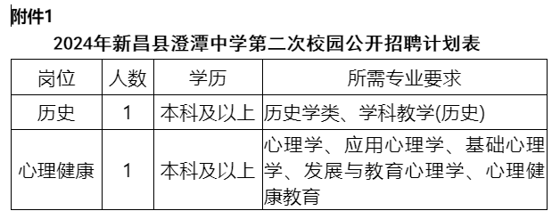 2024年新昌县澄潭中学计划第二次校园公开自主招聘教师2名,具体招聘岗位、人数、学历和专业要求等详见《2024年新昌县澄潭中学校园公开招聘教师计划表》。