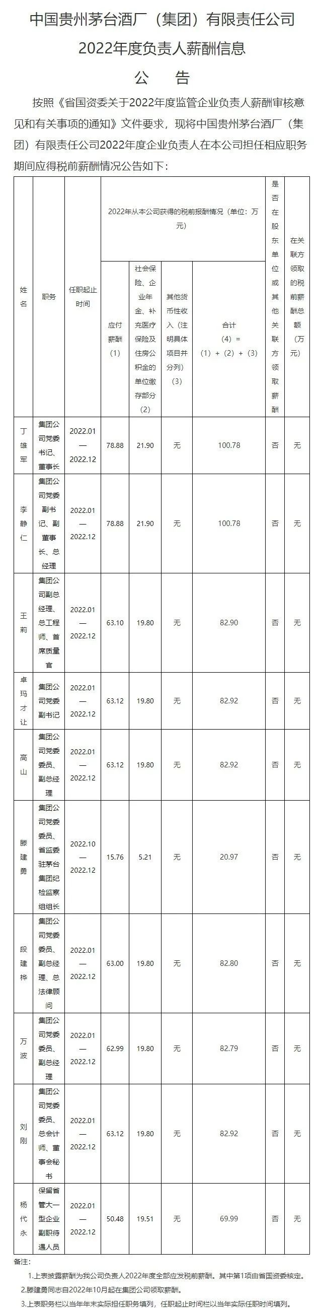 在公布的10人名单中,除丁雄军税前报酬超百万外,时任茅台集团公司党委副书记、副董事长、总经理李静仁与丁雄军同酬。时任茅台集团公司副总经理、总工程师、首席质量官王莉等6人税前报酬都在82万元上下。茅台集团公司党委委员、省监委驻茅台集团纪检监察组组长滕建勇因2022年10月才在集团公司领取薪酬,税前报酬为20.97万元。保留省管大一型企业副职待遇人员杨代永税前报酬为69.99万元。