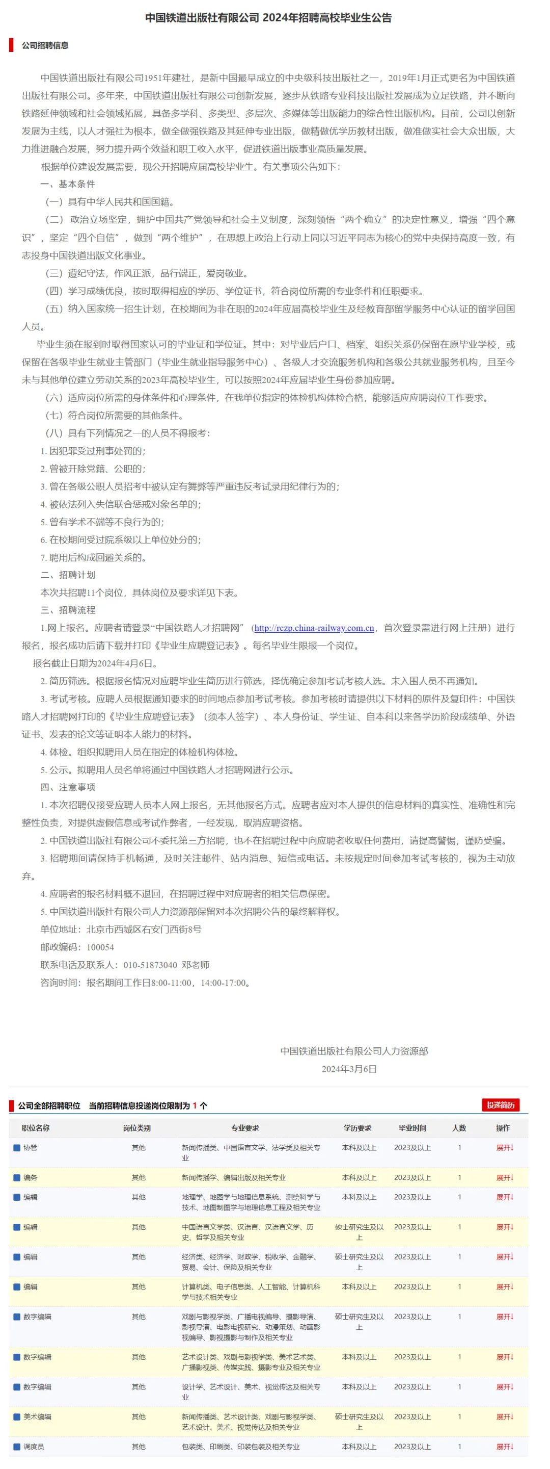 北京招聘,解决北京户口,中国铁道出版社2024年招聘