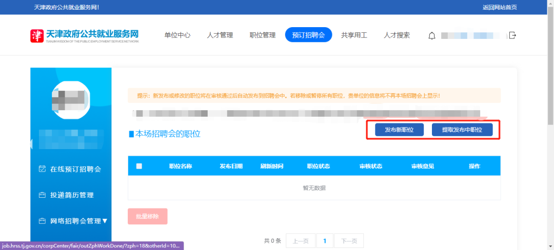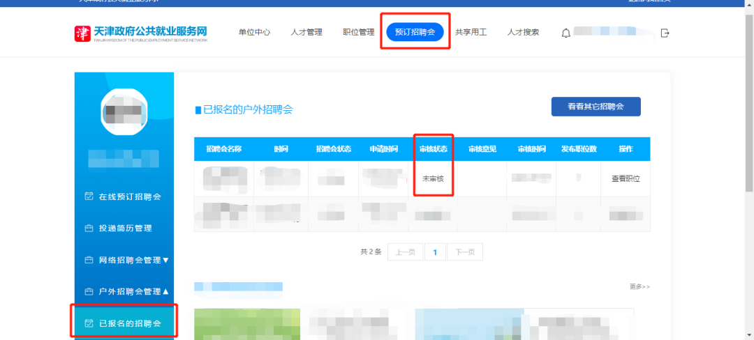 点击上方顶栏的“预定招聘会”按钮,再点击侧栏的“户外招聘会管理—已报名的招聘会”按钮,查看审核状态。
