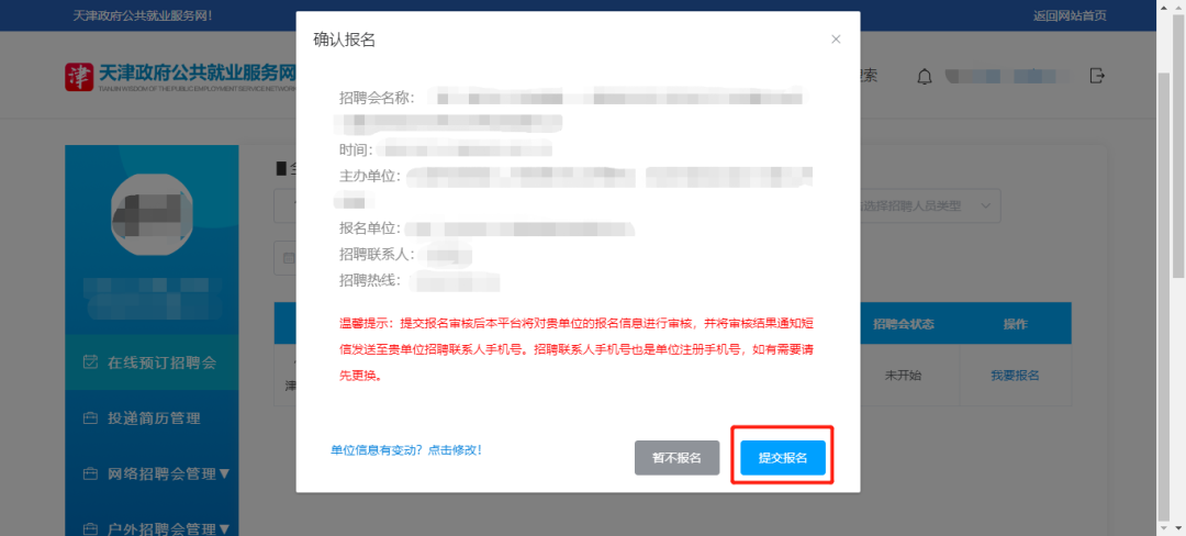 3、点击后弹出报名确认框,若确定无误,则点击”提交报名”按钮。