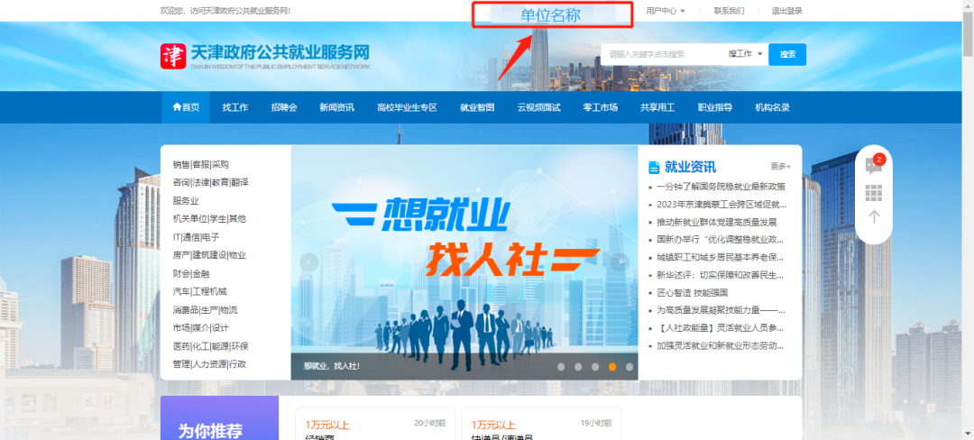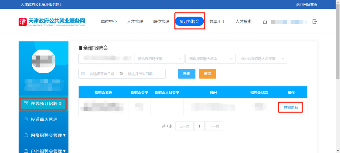 2、点击首页上方的单位名称后,跳转至单位中心,点击上方顶栏的“预定招聘会”按钮,再点击侧栏的“在线预定招聘会”按钮,找到对应招聘会名称,点击右侧“我要报名”按钮,报名活动。