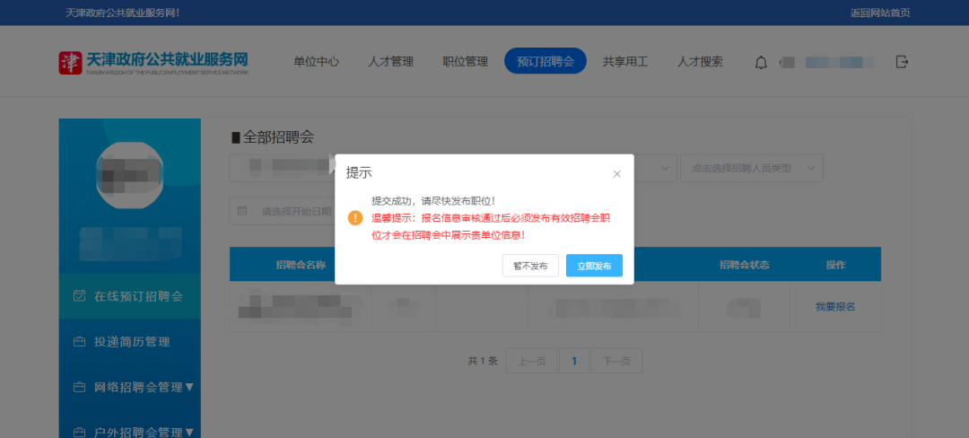4、报名成功后弹出职位提示框,提示需要发布职位,点击“立即发布”按钮,选择“发布新职位”或选择“提取已发布中的职位”进行职位发布。