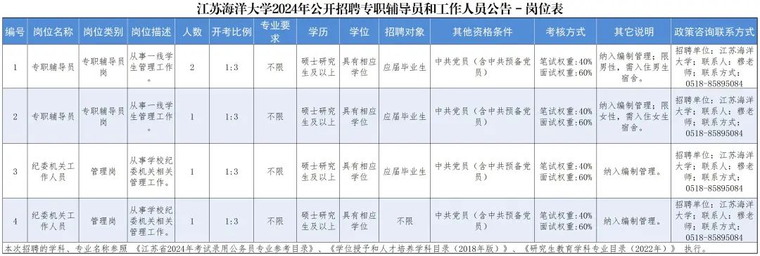 1.笔试内容:1~2号岗结合辅导员岗位实际工作要求,从所需要的基础知识和基本应用能力等方面进行考查,不指定大纲和教材。3~4号岗结合高校纪检岗位实际工作要求,方向为行政职业能力测试和申论(参照江苏公务员考试),不指定大纲和教材。