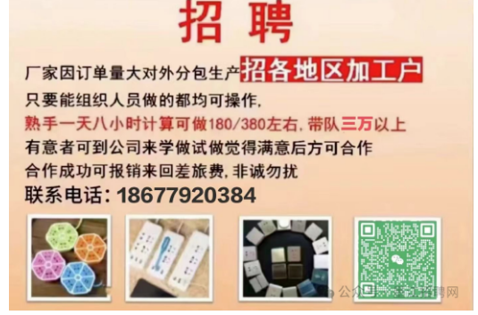 工厂手工活外包加工组装,招各地区加工户,只要能组织人员做的都均可操作,熟手一天八小时计算可做180/380左右,带队三万以上,有意者可来工厂,觉得满意后方可合作。