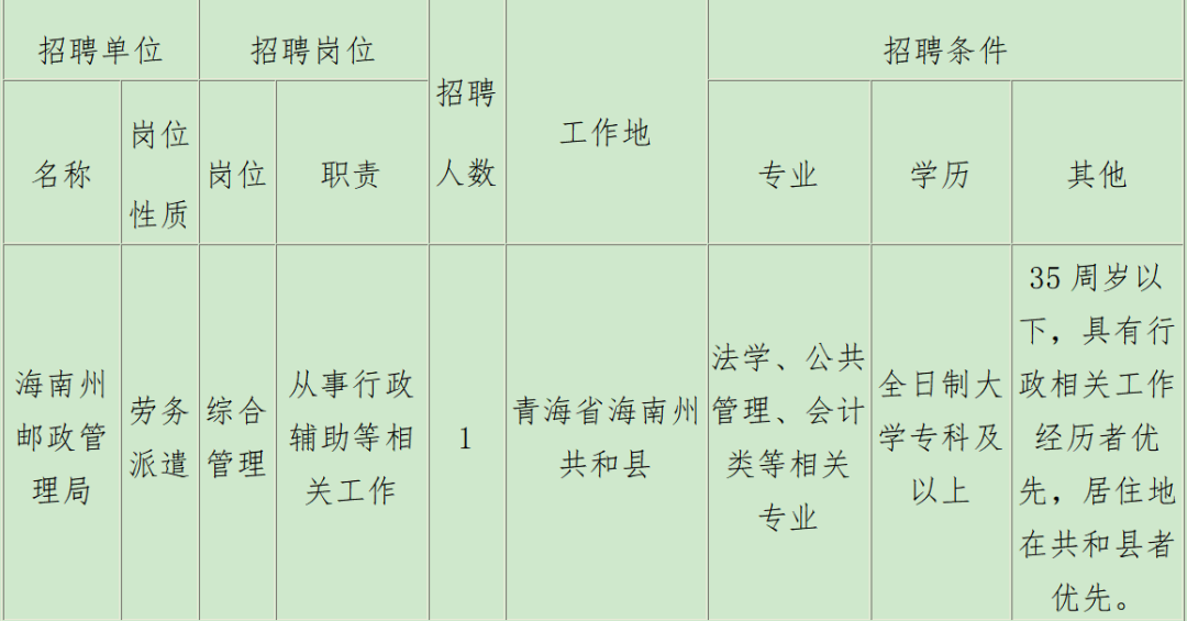 海南州邮政管理局是中央编办批设的副县级邮政监管机构,负责全州邮政行业管理工作,履行政府监管职能,主要职责为贯彻执行国家关于邮政业管理的法律法规、方针政策和邮政服务标准;监督管理所在地区邮政市场;组织协调所在地区邮政普遍服务以及机要通信、义务兵通信、党报党刊发行、盲人读物寄递等特殊服务的实施等。根据工作需要,拟面向社会公开招聘工作人员1名。现将有关事项公告如下。