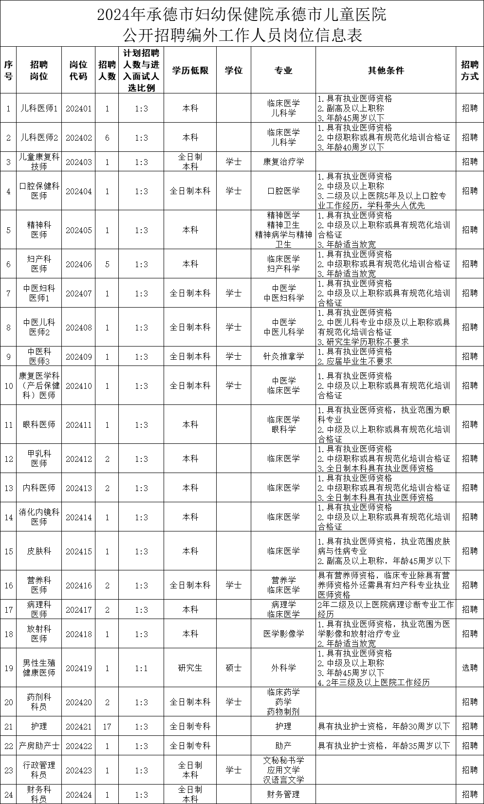 本次拟对医疗、医技、护理、助产、管理等岗位面向社会公开招聘编外工作人员54名,具体招聘岗位、招聘人数、招聘要求详情见附件《2024年承德市妇幼保健院承德市儿童医院公开招聘编外工作人员岗位信息表》。坚持德才兼备,实行公正、公平、公开、竞争、择优的原则。
