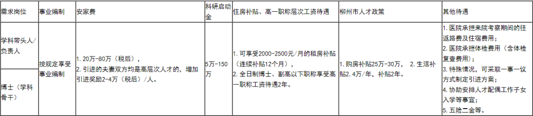 四、报名、应聘程序 (一)报名时间 2024年3月6日至2024年7月31日。 (二)报名方式 报考人员在规定报名时间内登录报名系统(网址http://lzrsj.gkzpfw.ex1.https.443.g0.ipv6.liuzhou.gov.cn/)进行报名,每人限报一个岗位。 (三) 初选 医院综合应聘人员基本情况和综合条件,择优筛选后发出面试通知。 (四)资格审查 依据本公告规定的招聘岗位资格条件对报名者进行资格审查。 应聘人员须提供以下材料:简历应包括高中以上的毕业证、学位证、学历电子备案表,初级及以上职称证书,英语等级证书,计算机等级证书,并包含以下材料: 1.反映学术水平和科研成果的论著目录及学术论文检索号(学术论文目录包括作者排名、题目、杂志或会议名称、年卷〈期〉等)。能反映本人专业技术能力的手术操作视频、疑难病例、技术报告、学术报告等。 2.重要科技成果获奖情况(包括奖项名称、级别、年度、本人排名和获奖证书复印件、专利及成果应用等)、重要社会学术团体兼职情况及各类人才称号等其它荣誉。 3.已完成的和在研的科研项目,包括项目名称、本人作用(主持或参与)、项目来源、经费总额、研究意义及在本学科专业领域的学术地位。 (五)考核 按照各岗位招聘人数1:1的比例确定考核人选名单。考核主要是考察应聘人员的思想政治表现、道德品质、业务能力、工作业绩等基本情况,结合应聘岗位的实际情况采取灵活的方式进行面试、考试、考核。并对应聘人员资格条件进行复查,对应聘人员提供的相关材料的原件进行审核。 (六)体检、心理测试 体检由招聘单位组织在三甲医院体检,体检参照公务员录用体检标准执行。对于在体检过程中弄虚作假或者隐瞒真实情况致使体检结果失真的体检者,不予聘用。心理测试不计入考核成绩,不合格者一票否决制。 (七)报医院审批 体检合格后,经过院长办公会或院党委会集体研究讨论决定,择优确定拟聘用人员。 (八)公示和聘用 根据考核情况确定拟聘用人员名单在柳州人力资源和社会保障局网站进行公示,公示期为7日。经公示期满无异议的,按程序办理聘用审批手续。