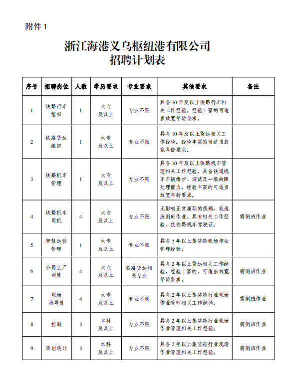 本次计划招聘29人,具体招聘岗位、招聘要求及人数详见《浙江海港义乌枢纽港有限公司招聘计划表》(附件1)。