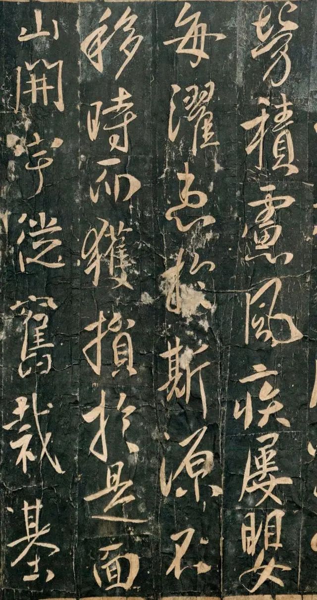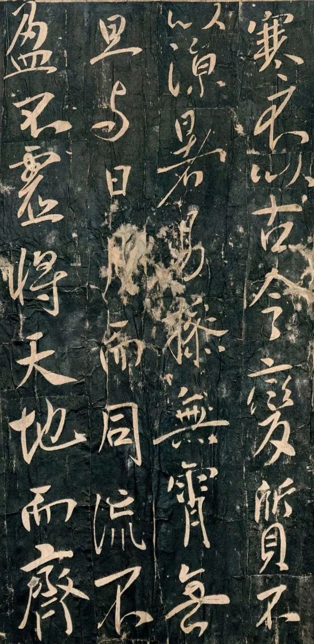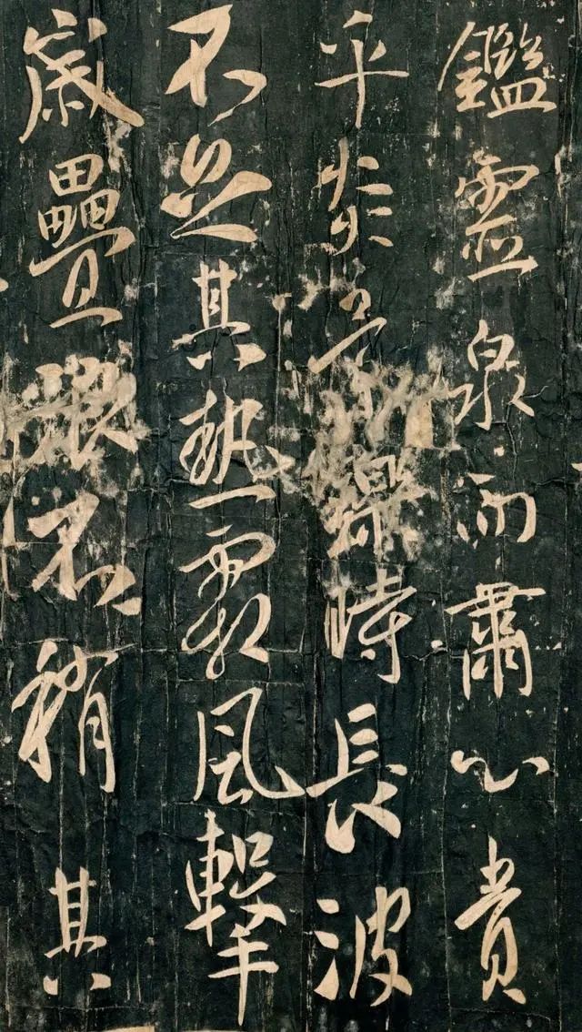 从传世的唐拓孤本上看,唐太宗此篇铭文行距当略大于字距,字体行、草相间,上下字明连的牵丝没有出现,更多采用的是一种暗连的形式,使上下文贯气,这一点更接近于《兰亭序》的章法布局。