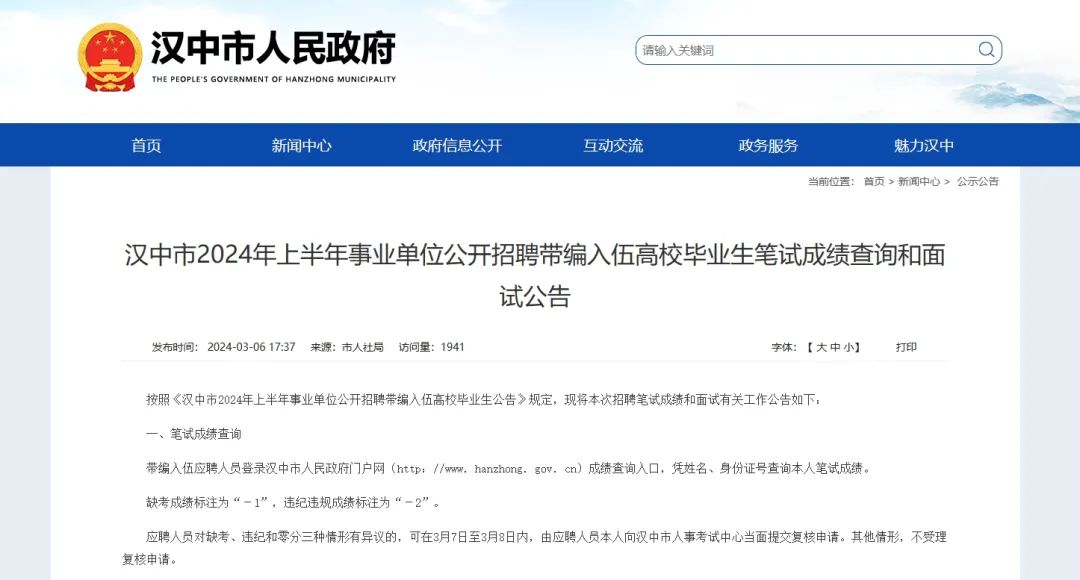 按照《汉中市2024年上半年事业单位公开招聘带编入伍高校毕业生公告》规定,现将本次招聘笔试成绩和面试有关工作公告如下: