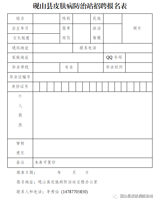 3.现场报名:砚山县皮肤病防治站招聘报名表,个人简历1份,身份证、毕业证、学位证及相关执业资格原件。