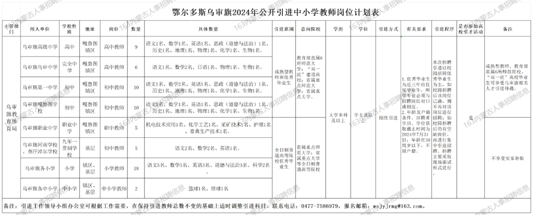 鄂尔多斯市乌审旗2024年公开引进中小学教师岗位计划表(公告)