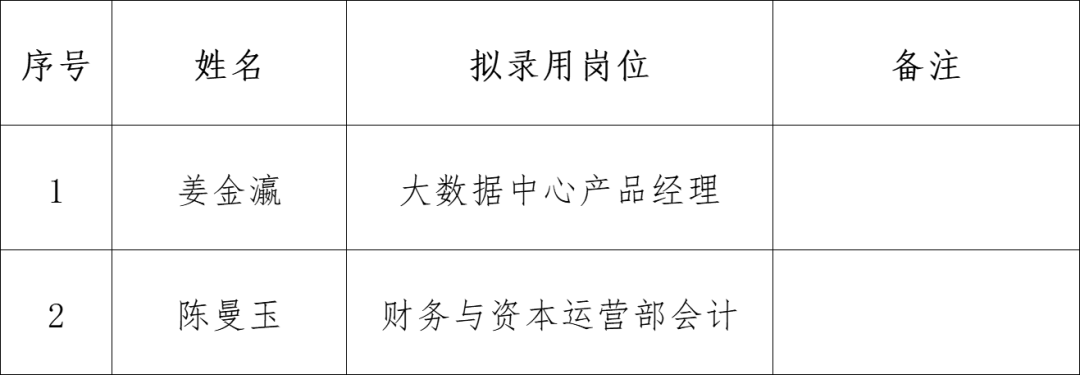 根据《河南能源人力资源发展集团有限公司市场化选聘公告》要求,经报名、资格审查和初步筛选、笔试、面试、背景调查(组织考察)、体检等程序,拟录用2名同志(具体名单详见下表)。