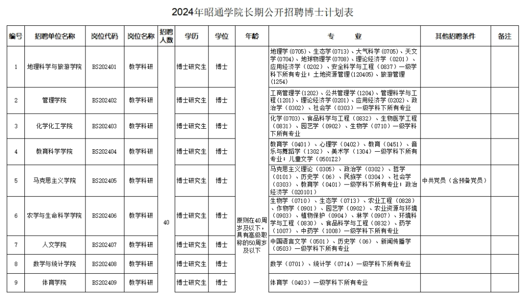 具体招聘岗位及招聘条件,详见《2024年昭通学院长期公开招聘博士计划表》(附件1)。