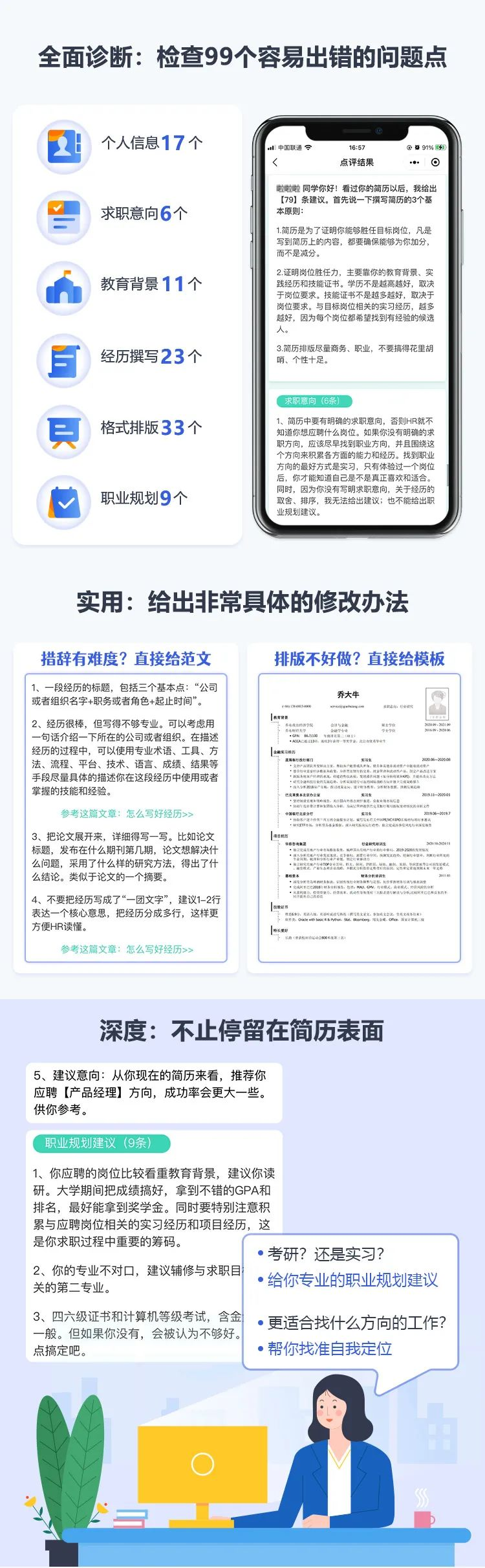 检查简历易错点的同时,还会给出具体的修改方法,同时针对你的情况,给出实用建议!本次1v1简历点评服务