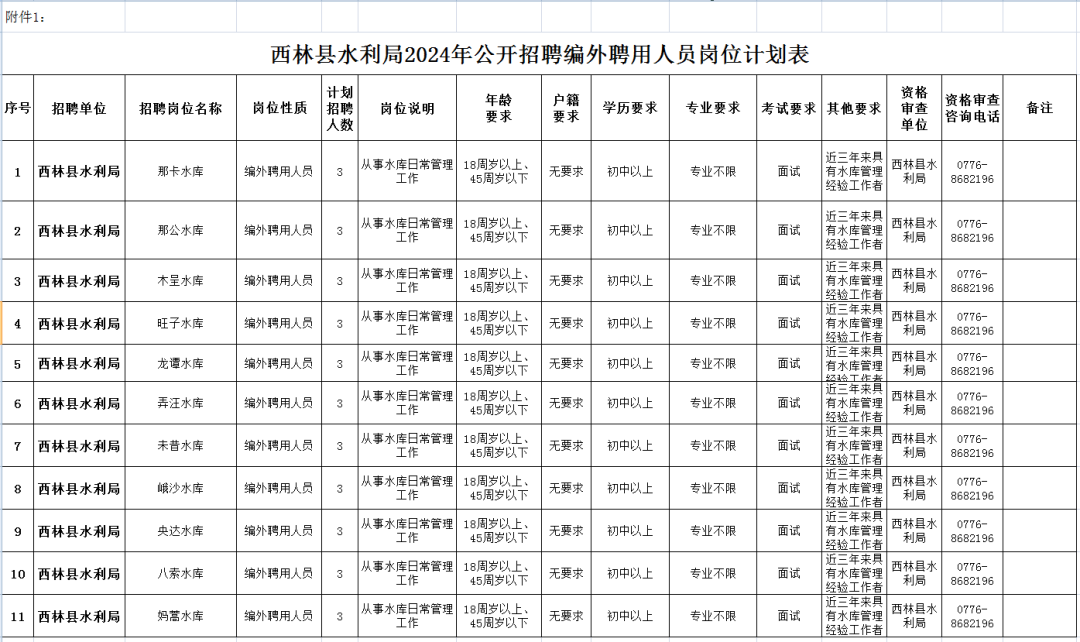 附件1:西林县水利局2024年公开招聘编外聘用人员岗位计划表