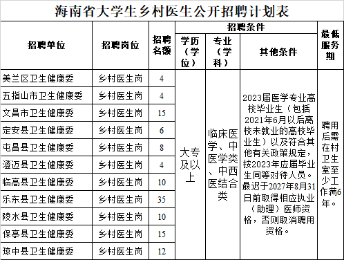 海南省公开招聘事业编制 大学生乡村医生公告 为进一步提升乡村医生队伍质量,根据国家有关部门相关要求,以及《海南省事业单位公开招聘工作人员实施办法》精神,经省人力资源和社会保障厅备案,决定面向社会公开招聘一批事业编制大学生乡村医生。现将有关事项公告如下: 一、招聘岗位 海南省面向社会公开招聘123名事业编制大学乡村医生,具体招聘岗位及人数等详见附件1。
