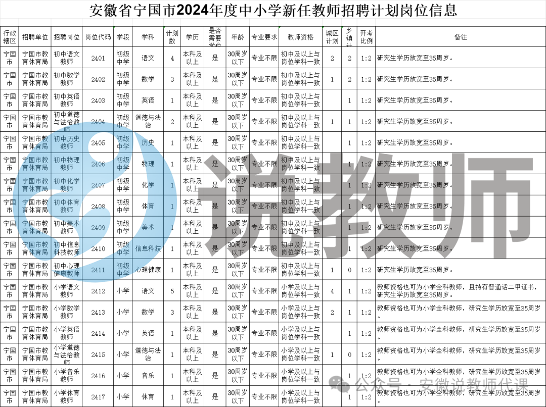根据教师招聘工作相关文件规定和要求,现就2024年度安徽省宁国市中小学新任教师公开招聘工作有关事项公告如下: 一、招聘原则 (一)坚持面向社会,公开招聘; (二)坚持考试考察,择优聘用; (三)坚持统一组织,分工负责。 二、招聘岗位计划 2024年度安徽省宁国市中小学新任教师公开招聘岗位计划共29名(见附件)。招聘岗位计划等信息在宁国市人民政府网(http://www.ningguo.gov.cn)、宁国市人民政府网站教育体育局部门网页(http://www.ningguo.gov.cn/Openness/Branch/408.html)统一发布。其他有关信息将陆续在宁国市人民政府网站“人事招考”专题专栏、宁国市人民政府网站教育体育局部门网页发布。 全省岗位表下载请加微信