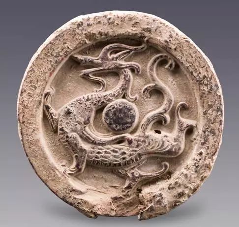 朱雀瓦当直径18.3厘米,或是凤,或是鸾,口衔宝珠,昂首翘尾;