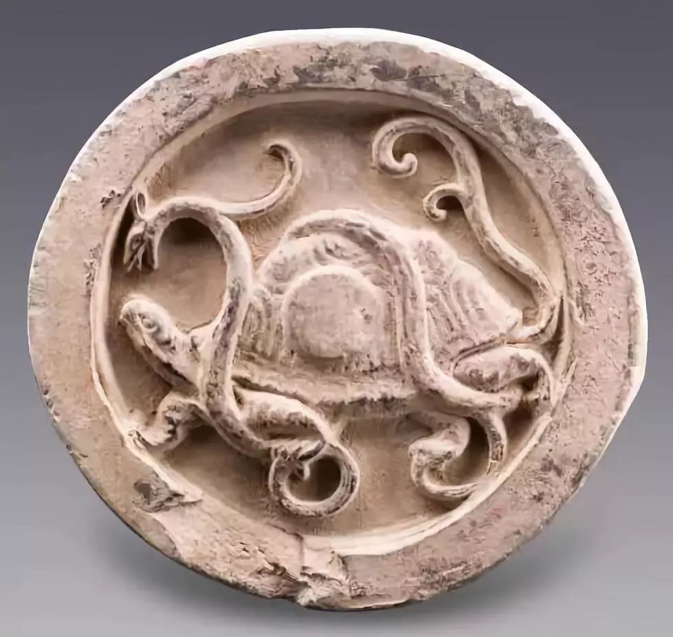 玄武瓦当直径19厘米,龟伏蛇曲,凝重不失活跃。