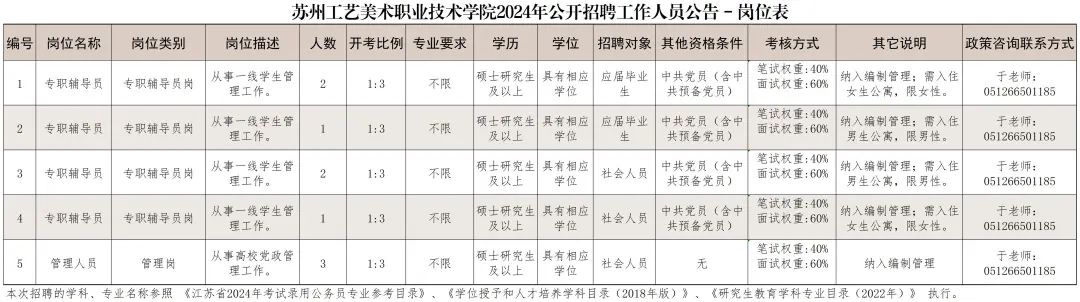 苏州工艺美术职业技术学院是省教育厅主管的全额拨款事业单位,位于江苏省苏州市吴中区国际教育园南区致能大道189号。为更好地选拔优秀适岗人才,充实人才队伍,优化师资结构,苏州工艺美术职业技术学院现面向社会公开招聘优秀人才。根据《江苏省事业单位公开招聘人员办法》等规定,现将有关事项公告如下: 一、报考条件 (一)具有中华人民共和国国籍,遵守中华人民共和国宪法和法律。 (二)遵纪守法,品行端正,团结协作,敬业乐群、廉洁奉公。 (三)适应岗位要求的身体条件。 (四)年龄要求为:硕士研究生年龄不超过35周岁(即1989年1月1日之后出生),博士研究生年龄不超过40周岁(即1984年1月1日之后出生),具有副高级专业技术职称的年龄不超过45周岁(即1979年1月1日之后出生),具有正高级专业技术职称的年龄不超过50周岁(即1974年1月1日以后出生)。报考管理人员岗位,具有高校教师系列中级职称的,年龄可放宽到40周岁(即1984年1月1日之后出生)。 (五)专职辅导员岗位还须具备下列条件之一: 1.在高校就读期间担任主要学生干部1年(12个月)以上。主要学生干部包括:班级正、副班长,团支部书记、党支部书记,院级团委、学生会、研究生会、社联正部长及以上学生干部,校团委、学生会、研究生会、社联副部长及以上学生干部,校级社团(协会)负责人; 2.有1年(12个月)以上高校专职辅导员工作经历; 3.有3年(36个月)以上企事业单位专职从事思想政治工作经历。专职从事思想政治工作是指在党的基层委员会、总支部委员会、支部委员会担任专职书记、副书记,或在纪检和党办、组织(人事)、宣传、统战等党的工作部门中专职从事思想政治工作,或在工会、共青团、妇联专职从事思想政治工作,以及专职从事思想教育或职业道德建设工作。工作经历指正式参加工作的经历,不含个人学生时期实习、兼职工作经历。 (六)具备报考岗位要求的专业、技能等资格条件(详见岗位表)。本次招聘的应届毕业生须于2024年8月31日前毕业并取得学历学位证书,且仍无工作单位。2022年和2023年普通高校毕业生,若仍未落实工作单位,其档案关系仍保留在原毕业学校,或保留在各级毕业生就业主管部门(毕业生就业指导服务中心)、人才交流服务机构和公共就业服务机构的,以及国(境)外同期毕业且已完成学历认证但仍未落实工作单位的人员,可应聘应届毕业生岗位。 国(境)外教学科研机构学习同期毕业人员,指在国(境)外教学科研机构学习,与国内应届毕业生同期毕业的留学人员,同期毕业的时间要求与国内应届毕业生一致。 工作经历任职年限计算截止到招聘公告发布之日。 (七)取得祖国大陆普通高校学历的台湾学生和取得祖国大陆承认学历的其他台湾居民应聘时按国家和我省有关规定执行。 二、报名 (一)报名时间、地点、方式 应聘人员通过“江苏省属事业单位公开招聘平台”报名,照片上传、资格初审和缴费确认,均通过网络同步进行。报名网址:https://rs.jshrss.jiangsu.gov.cn/index/f/RCRS_0056(江苏省人力资源和社会保障厅网上办事服务大厅) 1.报名、照片上传:3月8日9∶00-3月18日16∶00; 2.资格初审:3月8日9∶00-3月19日16∶00; 3.陈述申辩:3月8日-3月20日期间9∶00-16∶00; 4.对初审异议的处理:3月8日9∶00-3月20日18∶00; 5.缴费确认:3月8日9∶00-3月21日12∶00。 (二)网上确认 1.应聘人员网上提交报名信息24小时后(节假日顺延)可到报名网站查询是否通过招聘部门(单位)资格初审。 2.本次公开招聘收取报名费100元,通过初审后的应聘人员进行网上支付,在网上缴纳报名费100元。通过初审并且完成缴费确认的人员,即报名成功。 3.未按时在网上确认报名资格、上传照片、缴纳报名费的视为报名无效。 (三)报名注意事项 1.应聘人员按岗位要求和网上提示,如实填写有关信息,并上传本人近期免冠正面二寸(35X45毫米)证件照,jpg格式,大小为20Kb以下。 学校根据应聘人员提供的信息进行审核。应聘人员弄虚作假的,一经查实,即取消应聘资格。 2.应聘人员在填写报名信息时,请对照报考条件在“考生简历”栏中补充填写自己主要工作经历、专业技术职称等相关信息,须注明所在单位、所任职务以及任职起止年月,未填写的视作无相关经历。 依据应聘人员提供的信息进行初审,应聘人员弄虚作假的,一经查实,即取消应聘资格。 3.各招聘岗位的开考比例为1:3,如未达到开考比例,将核减或取消该招聘岗位,并在省人力资源社会保障网上公告。 4.应聘人员只能从岗位表选择一个岗位报名。资格初审通过后,不可更改报名信息。未通过资格初审的应聘人员,在报名期内,可以改报符合资格条件的其他岗位。应聘人员要使用在有效期内的第二代居民身份证进行报名,报名与考场使用的身份证必须一致。 5.有下列情形之一的,请勿报名应聘: ①现役军人、普通高校在读非应届毕业生; ②与事业单位负责人员有夫妻关系、直系血亲关系、三代以内旁系血亲关系或者近姻亲关系等亲属关系的,不得应聘事业单位的组织(人事)、纪检监察、审计财务岗位;与现有在岗人员存在上述关系的,不得应聘到岗后形成直接上下级领导关系的管理类岗位,以及《事业单位人事管理回避规定》明确应当回避的岗位; ③新《江苏省事业单位公开招聘人员办法》于2020年3月13日起施行,根据其后发布的事业单位公开招聘人员公告,被聘用到江苏省地方各类事业