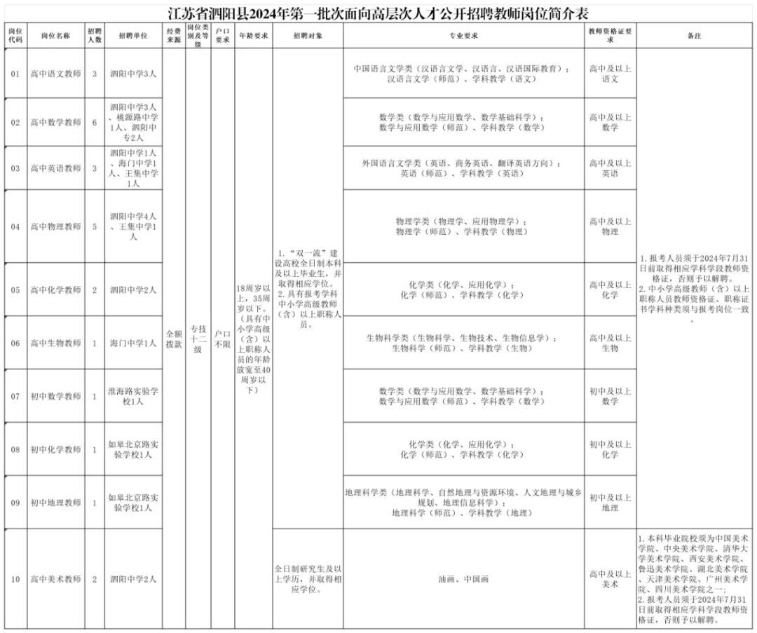 具体招聘单位、招聘岗位、计划招聘人数及相关要求等信息详见《江苏省泗阳县2024年第一批次面向高层次人才公开招聘教师岗位简介表》(附件1)。