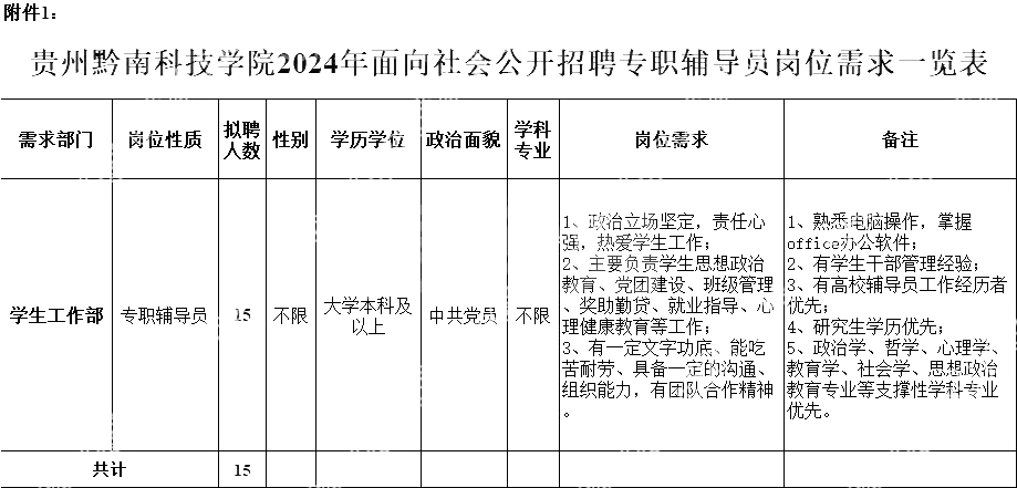 具体招聘岗位及要求详见《贵州黔南科技学院2024年面向社会公开招聘专职辅导员岗位需求一览表》(附件1)。