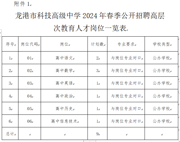 招聘岗位具体详见《龙港市科技高级中学2024年春季公开招聘高层次教育人才岗位一览表》(附件1)