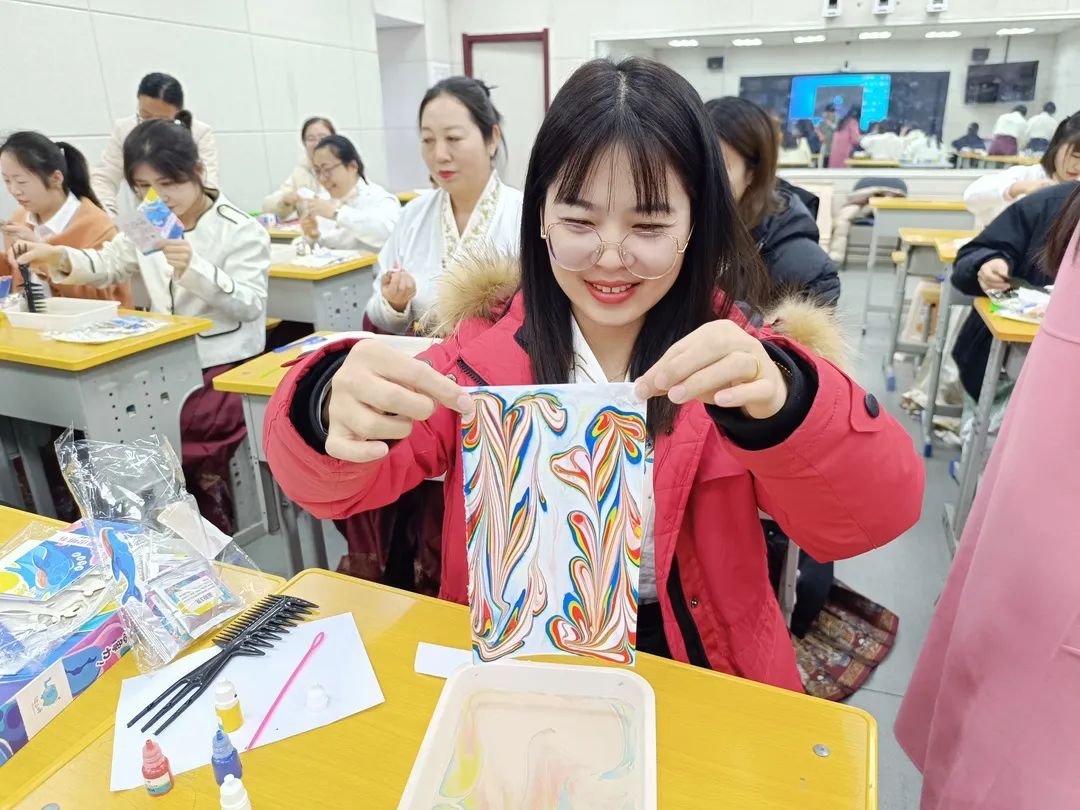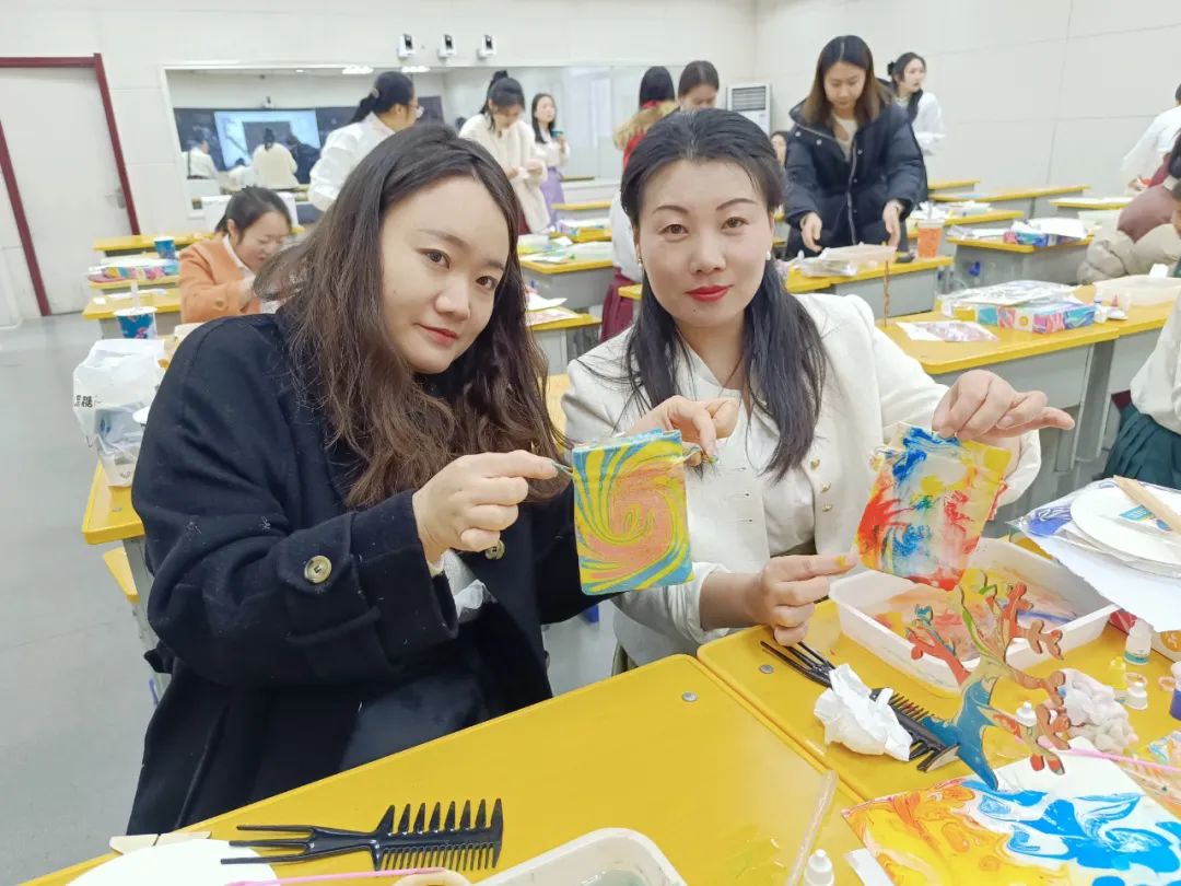 在工会的组织下,三个学部的教师分别到会议室、录播教室、书法教师体验了水拓画带来的奇妙感觉。三位美术老师给“学生”们介绍了水拓画的基本原理、历史背景、特点,并传授了做水拓画的方法与技巧。老师们兴致勃勃地开始了创作。有的独自创作,有的自发组团探究,有的“串场”求教……大家兴趣高涨,其乐融融。最后各年级组展示了优秀的水拓画作品,激发了大家的兴趣和好奇心。
