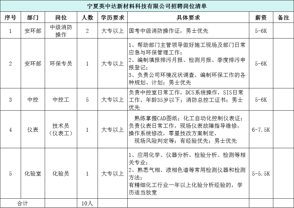 >招聘丨宁夏英中达新材料有限公司招聘简章