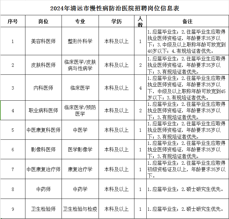 >清远市慢性病防治医院,2024年上半年人才招聘公告