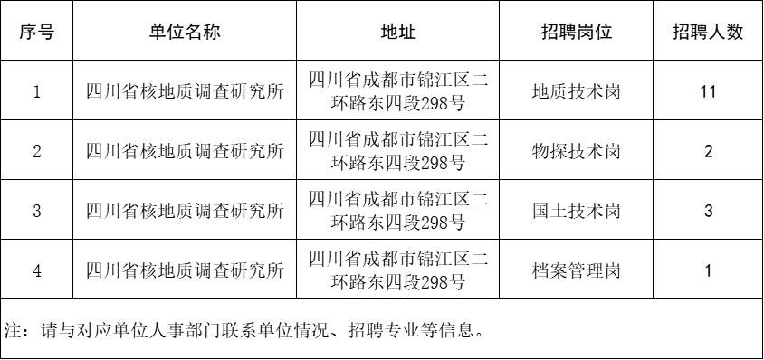根据《四川省省属事业单位公开招聘工作人员实施细则(试行)》(川人发〔2006〕34号)、《四川省人力资源和社会保障厅关于考核招聘地勘水文急需短缺专业技术岗位工作人员的通知》(川人社函〔2022〕528号)有关规定,四川省核地质调查研究所拟面向全国公开考核招聘17名工作人员。现将有关事项公告如下。