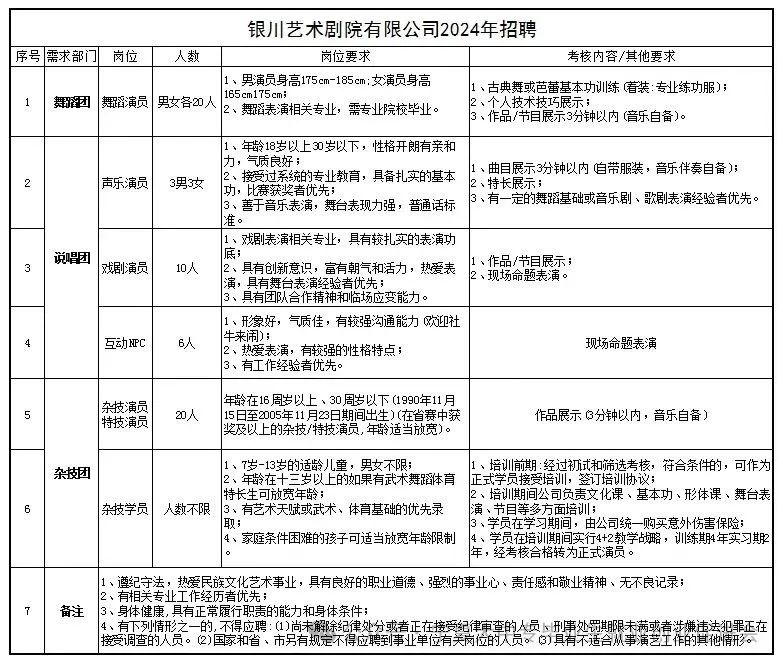 银川招聘求职的好帮手,每日推送银川人事考试信息、招聘招考信息,职场人的干货等。银川艺术剧院有限公司始建于1958年,其前身为银川说唱艺术团、银川杂技团、银川艺术剧院,2010年合并成立银川艺术剧院有限公司,为国有文化企业,隶属银川市文化旅游广电局。历经多年创新发展,公司已成为集舞台艺术创作演出、舞美制作、艺术培训、剧场管理、创意经营为一体的综合国有艺术生产经营院团。为满足工作需要,根据银川艺术剧院有限公司有关规定,现将有关岗位招聘事项公告如下: