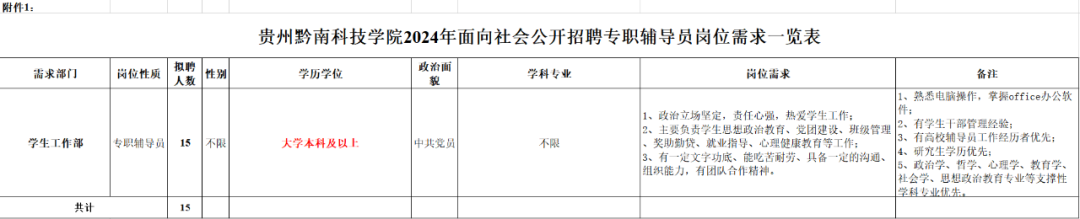 具体招聘岗位及要求详见《贵州黔南科技学院2024年面向社会公开招聘专职辅导员岗位需求一览表》(附件1)。