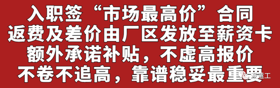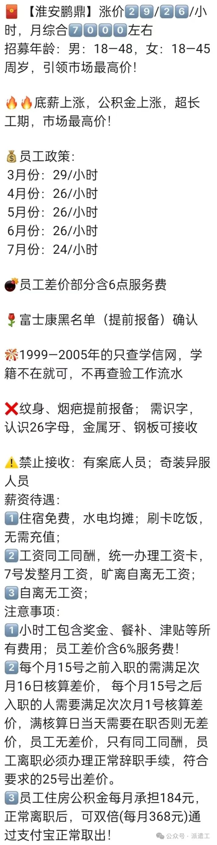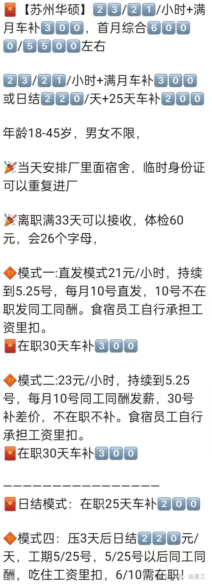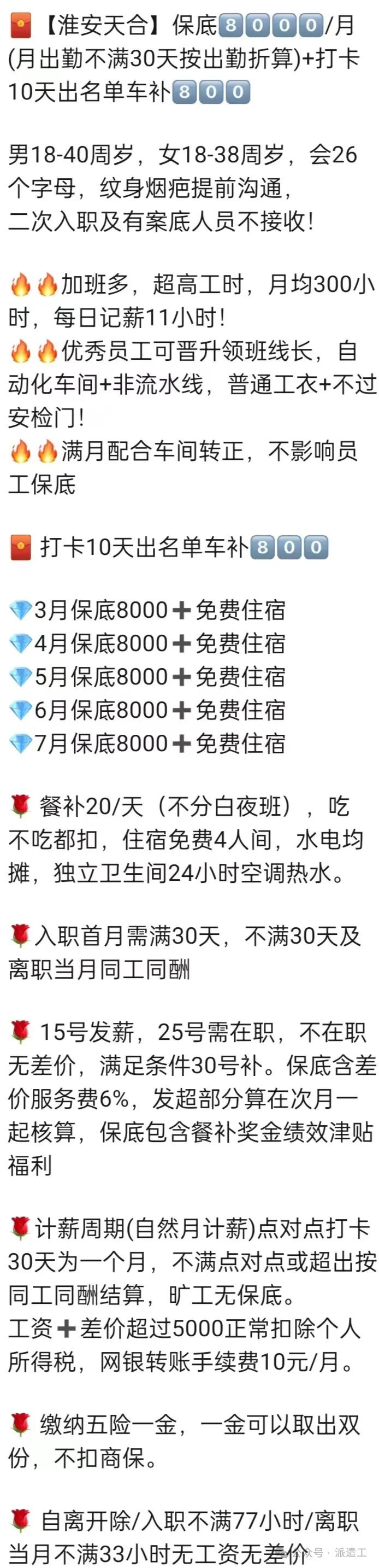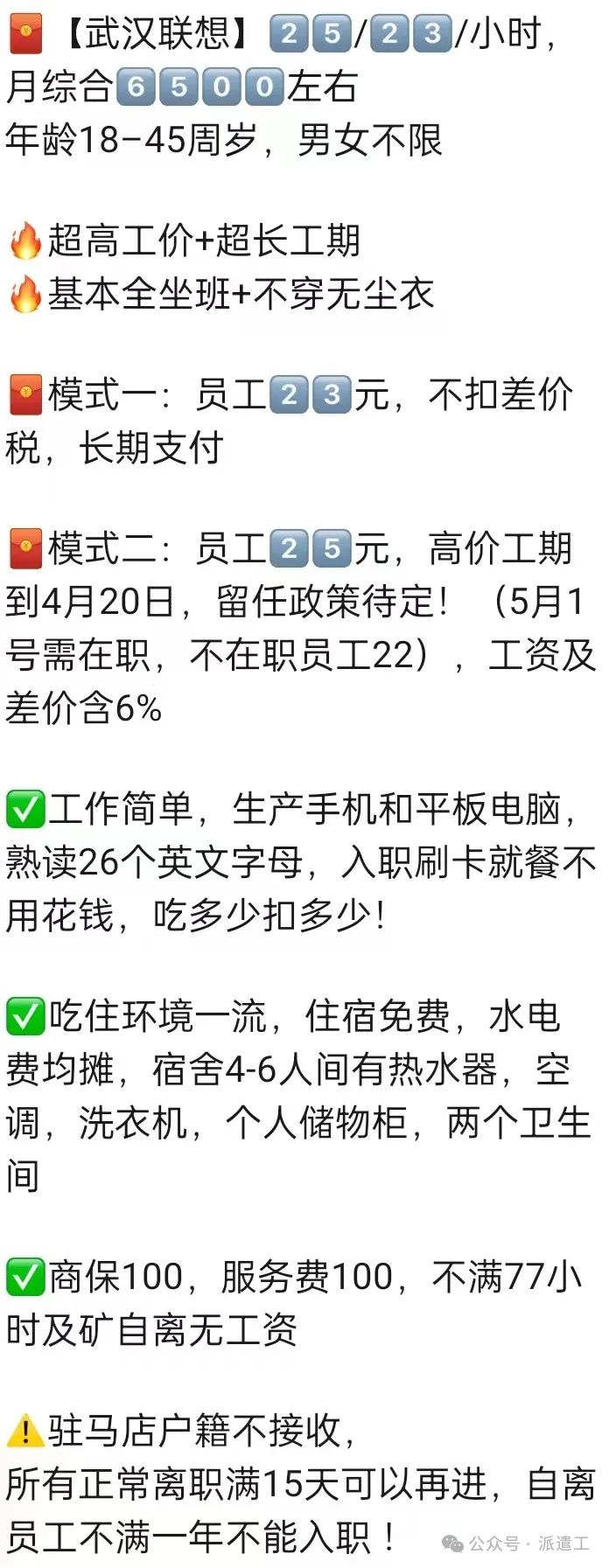 💰前60天员工打包价29元/小时(同工同酬工资+差价补贴)差价补贴需要满足员工差价补贴发放标准(以亿签网为准)【二次补贴】员工做满90天后,前60天按打包价29元/时(四川户籍27元),后30天按打包价20元/小时(四川户籍18元)一次性补足剩余差价,超出为个人所得,打包价包含同工同酬工资和厂区的所有补贴【面试当天算工期,旷自离无所有费用,入职后下产线计算工时,入职下产线后计算工时,离职需正常办理。】【特别说明】报备名单时按员工实际单价进行报备,禁止与员工私下再行约定返费,如有约定且隐瞒此消息,将承担给派遣公司造成的所有经济责任!2、工期满后根据厂区订单情况再具体出相关留任政策。2、身体健康,无明显纹身,体内不带金属(体检费50元,住宿钥匙压金20)5、提示!提示!所有人工友工资从下产线开始计算工时。【武汉富士康】