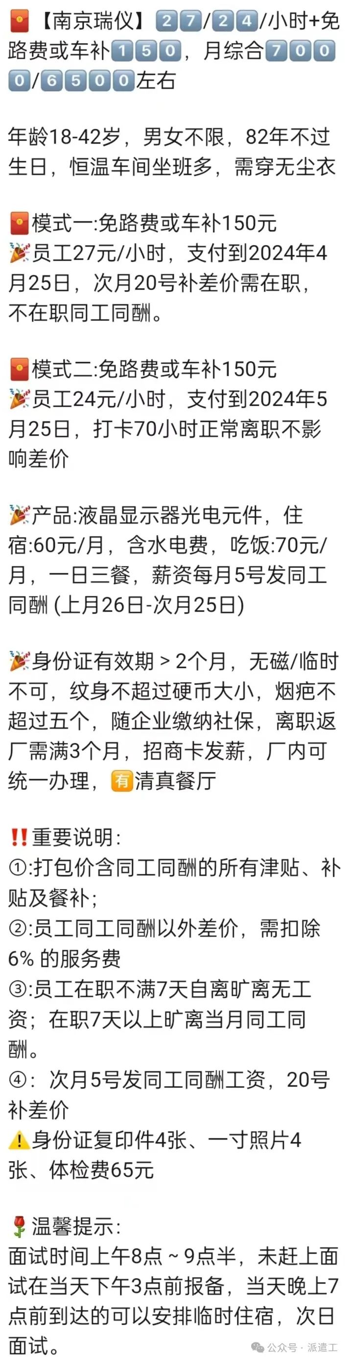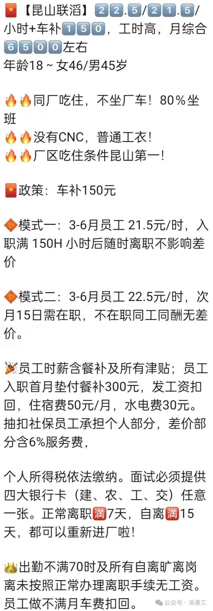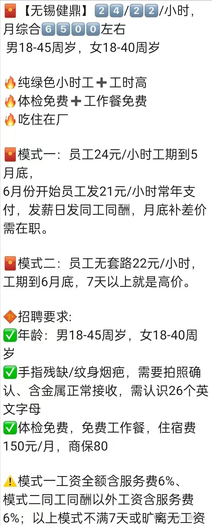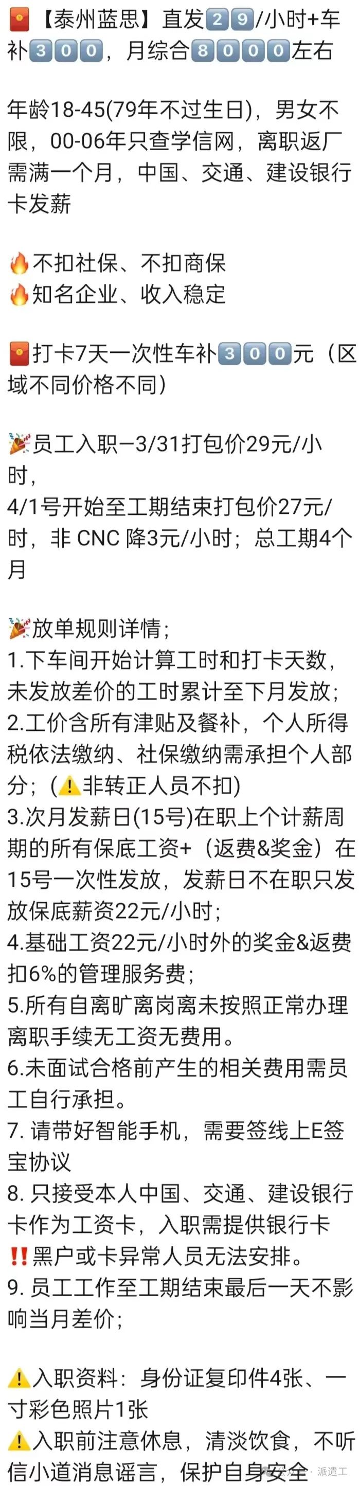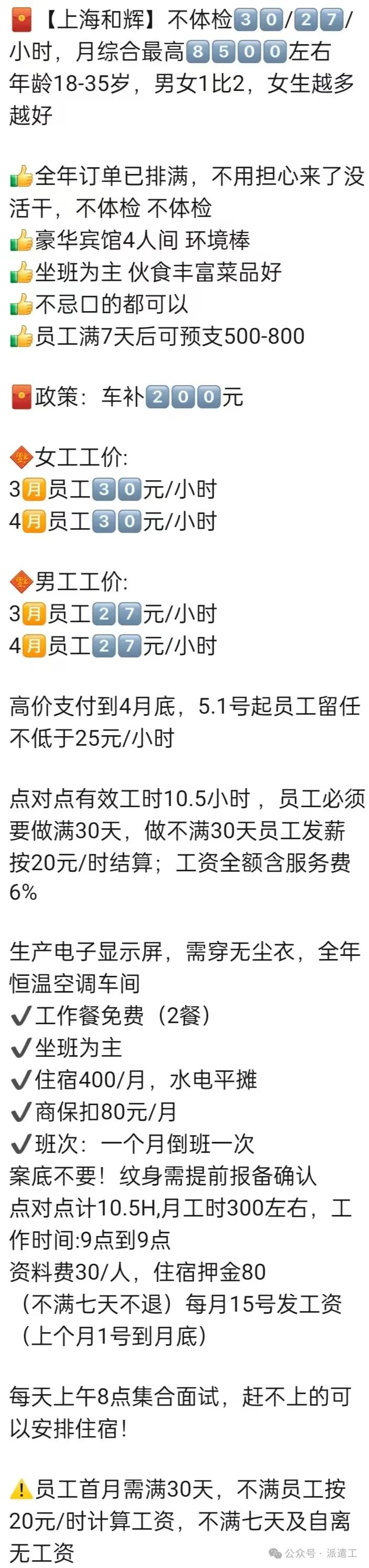 💰前60天员工打包价29元/小时(同工同酬工资+差价补贴)差价补贴需要满足员工差价补贴发放标准(以亿签网为准)【二次补贴】员工做满90天后,前60天按打包价29元/时(四川户籍27元),后30天按打包价20元/小时(四川户籍18元)一次性补足剩余差价,超出为个人所得,打包价包含同工同酬工资和厂区的所有补贴【面试当天算工期,旷自离无所有费用,入职后下产线计算工时,入职下产线后计算工时,离职需正常办理。】【特别说明】报备名单时按员工实际单价进行报备,禁止与员工私下再行约定返费,如有约定且隐瞒此消息,将承担给派遣公司造成的所有经济责任!2、工期满后根据厂区订单情况再具体出相关留任政策。2、身体健康,无明显纹身,体内不带金属(体检费50元,住宿钥匙压金20)5、提示!提示!所有人工友工资从下产线开始计算工时。【武汉富士康】