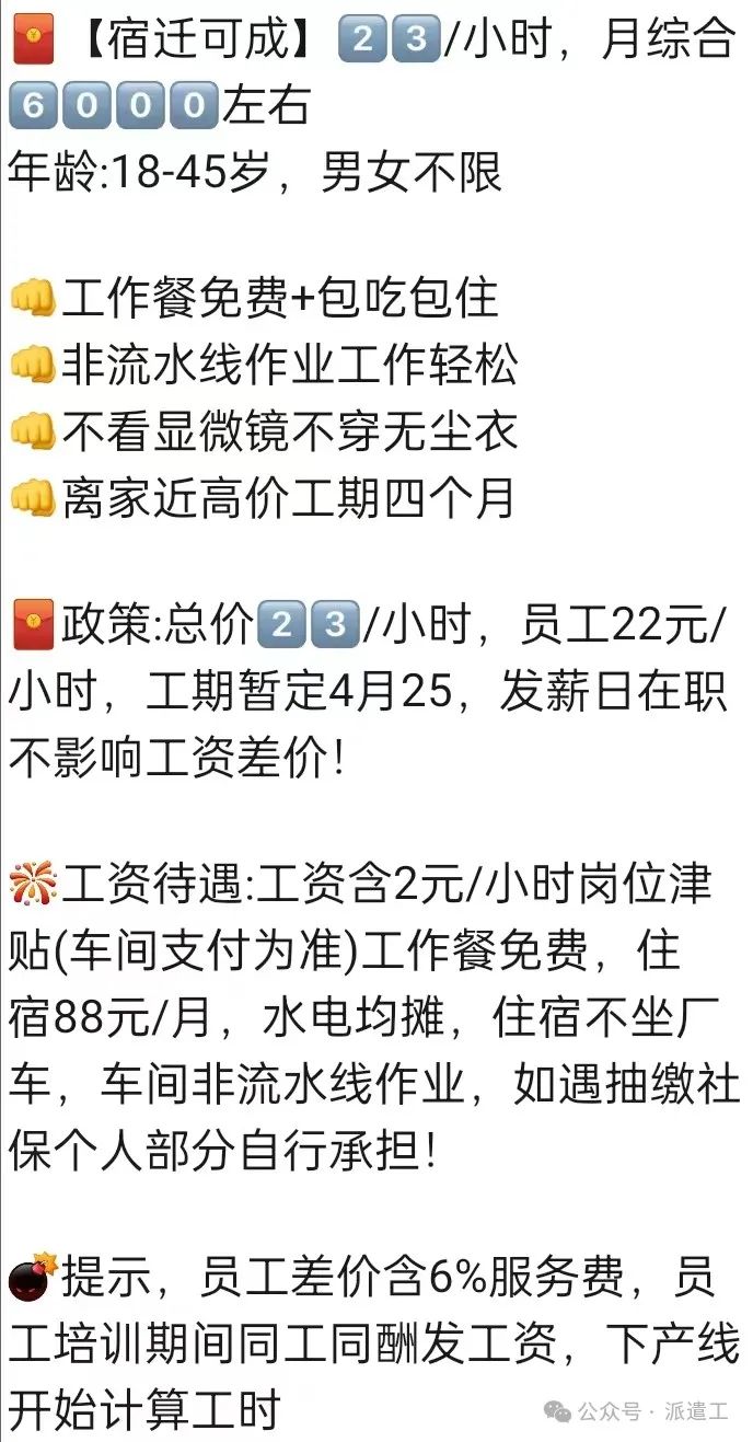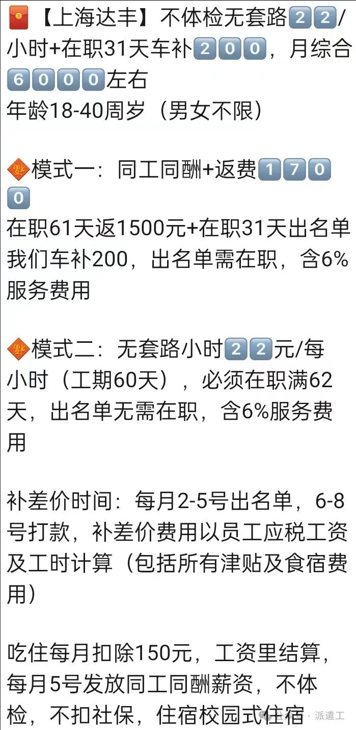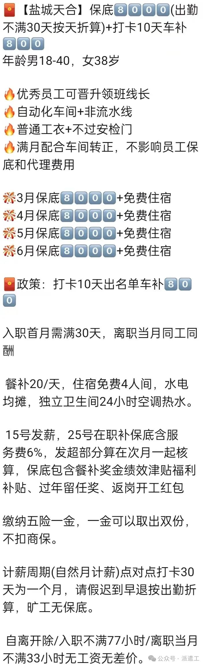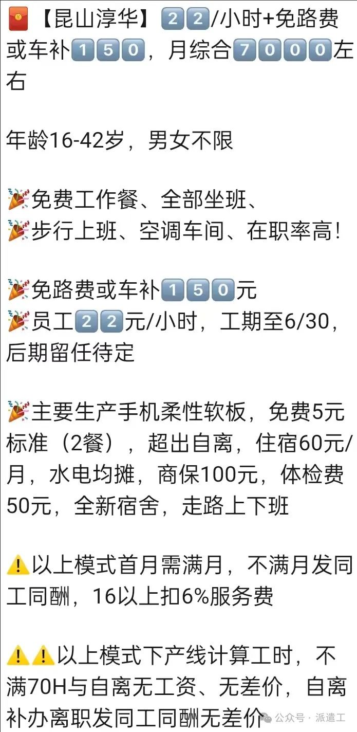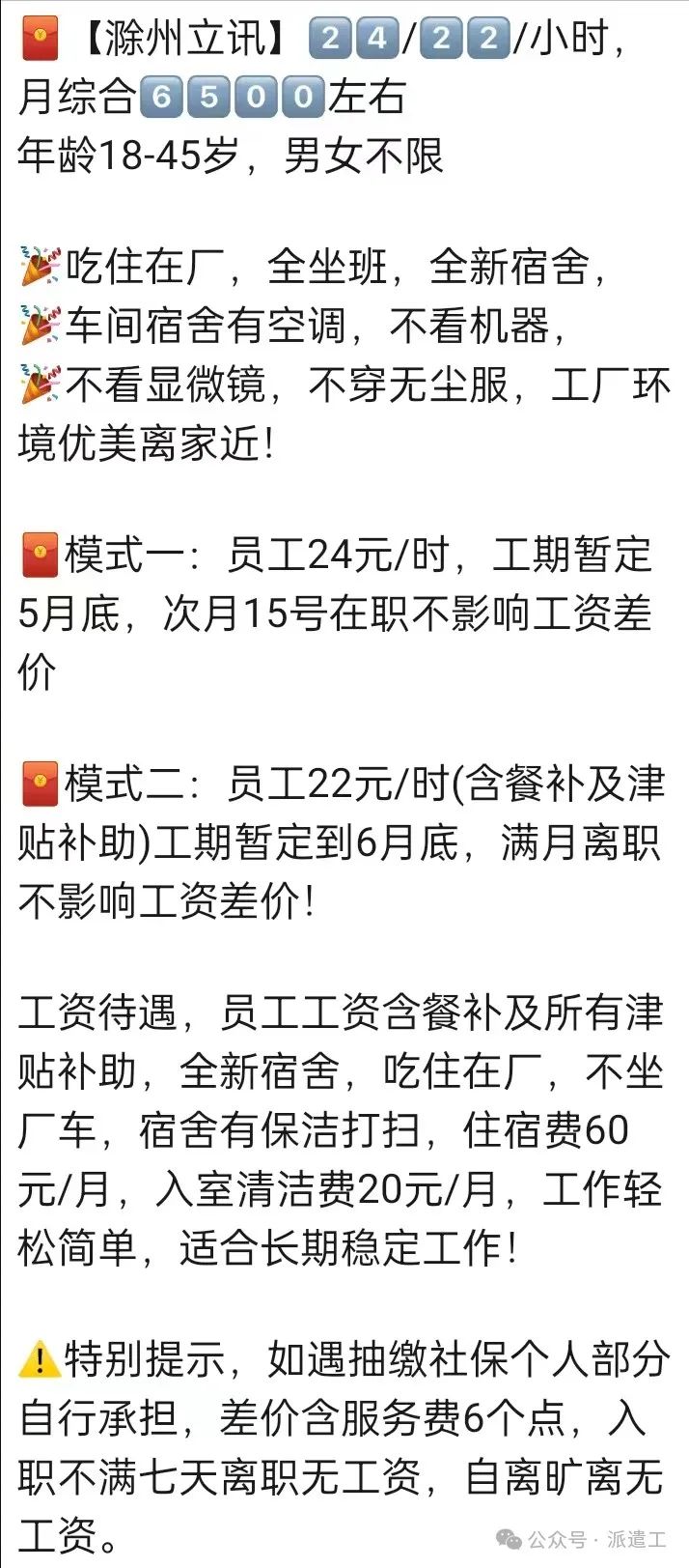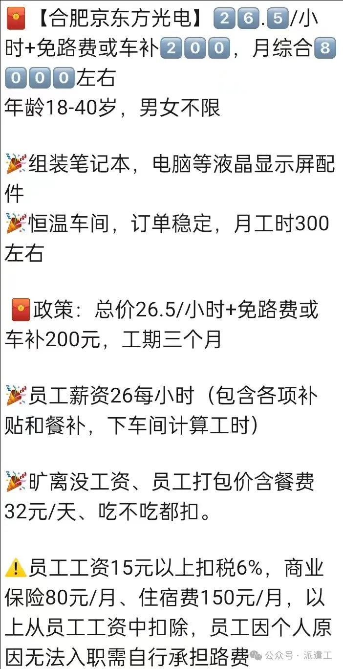 💰前60天员工打包价29元/小时(同工同酬工资+差价补贴)差价补贴需要满足员工差价补贴发放标准(以亿签网为准)【二次补贴】员工做满90天后,前60天按打包价29元/时(四川户籍27元),后30天按打包价20元/小时(四川户籍18元)一次性补足剩余差价,超出为个人所得,打包价包含同工同酬工资和厂区的所有补贴【面试当天算工期,旷自离无所有费用,入职后下产线计算工时,入职下产线后计算工时,离职需正常办理。】【特别说明】报备名单时按员工实际单价进行报备,禁止与员工私下再行约定返费,如有约定且隐瞒此消息,将承担给派遣公司造成的所有经济责任!2、工期满后根据厂区订单情况再具体出相关留任政策。2、身体健康,无明显纹身,体内不带金属(体检费50元,住宿钥匙压金20)5、提示!提示!所有人工友工资从下产线开始计算工时。【武汉富士康】